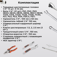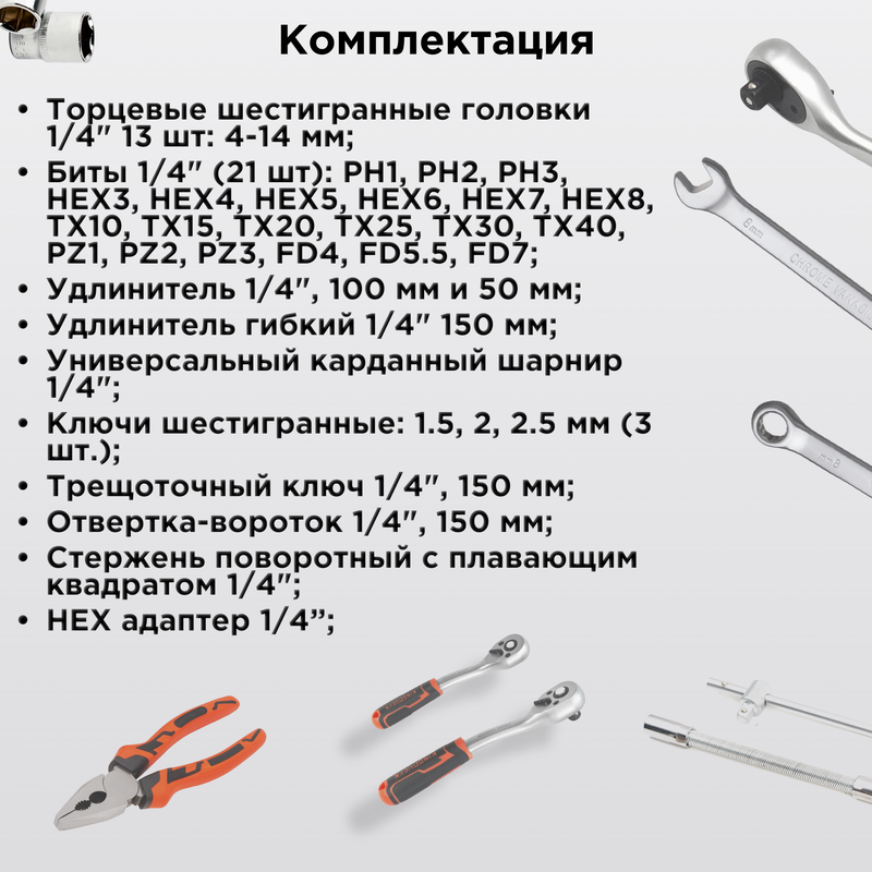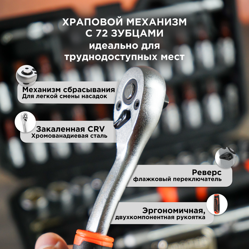 Набор инструментов KINGQUEEN - это высококачественный комплект для различных видов работ, который станет незаменимым помощником. Набор включает в себя широкий спектр инструментов, необходимых для выполнения различных задач в области ремонта, строительства, монтажа и других областях. Преимущества матового набора инструментов: Матовая поверхность инструментов обеспечивает улучшенную держимость и предотвращает скольжение, что позволяет выполнять работы с безопасностью. Трещотка на 72 зуба обеспечивает более точное и плавное вращение, обладает высокой прочностью и долговечностью. Инструменты изготовлен из хромованадиевой стали, что обеспечивает устойчивость к коррозии и стойкостью к большим нагрузкам