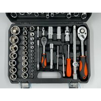 В набор входят комбинированные ключи, метрические шестигранные торцевые головки, свечные головки, трещотки, воротки, скользящие воротки и карданные шарниры. Это позволяет выполнять широкий спектр работ, включая монтаж и демонтаж различных деталей и компонентов.