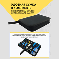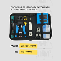 Кейс,Lan тестер, отвертка +/-, батарейка "крона" 9В, кейс для коннектеров, коннектор RG45- 10 шт, стриппер для зачастки проводов, обжимное устройство RJ45 RJ11 RJ12, нож для заделки контактов типа KRONE , стриппер для снятие изоляции, силиконовые накладки - 10 шт