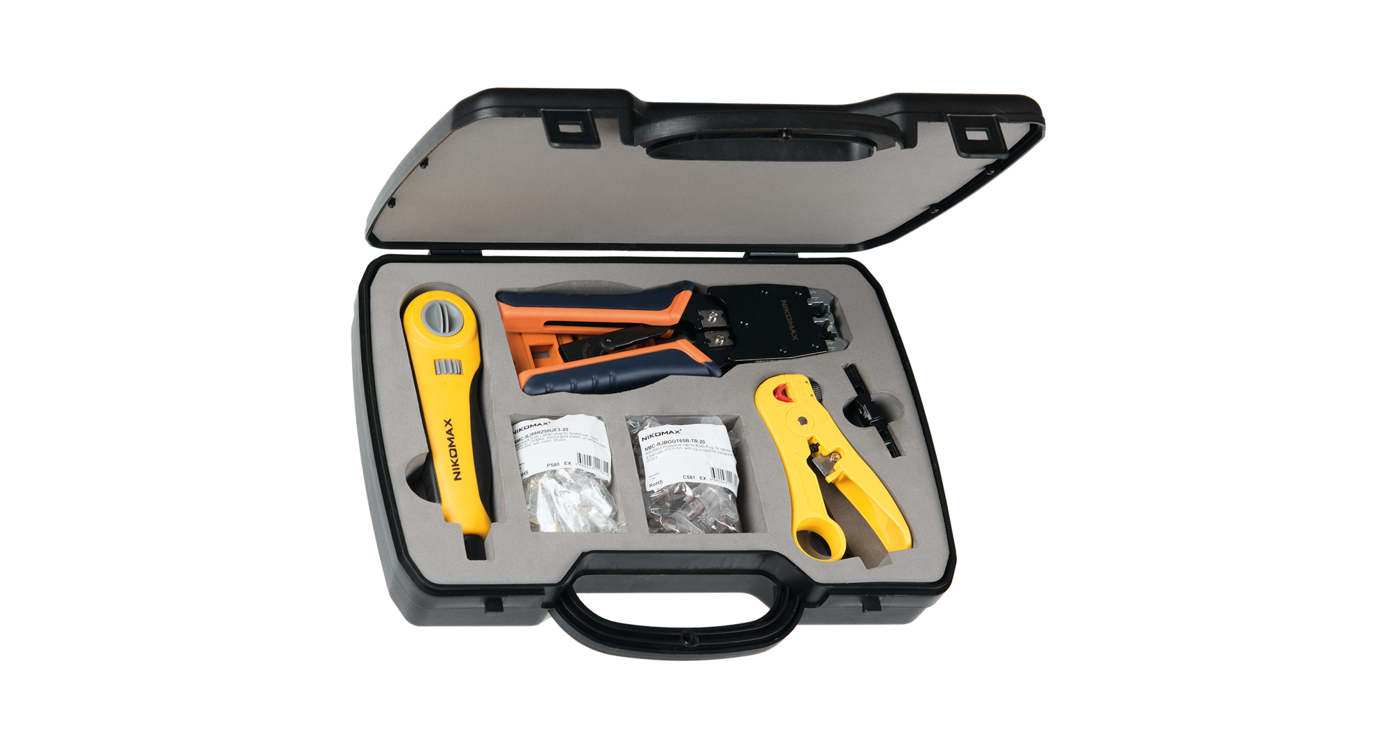 Комплектация: обжимной инструмент (NMC-500R), ударный инструмент (NMC-3640R) с двумя ножами (NMC-14TA и NMC-14TBK), стриппер (NMC-350), площадка для монтажа коммутационных модулей (NMC-KJ-FIX-OR), защитные колпачки (NMC-RJBOOT65B-TR-20), коннекторы (NMC-RJ88RZ50UE3-20)