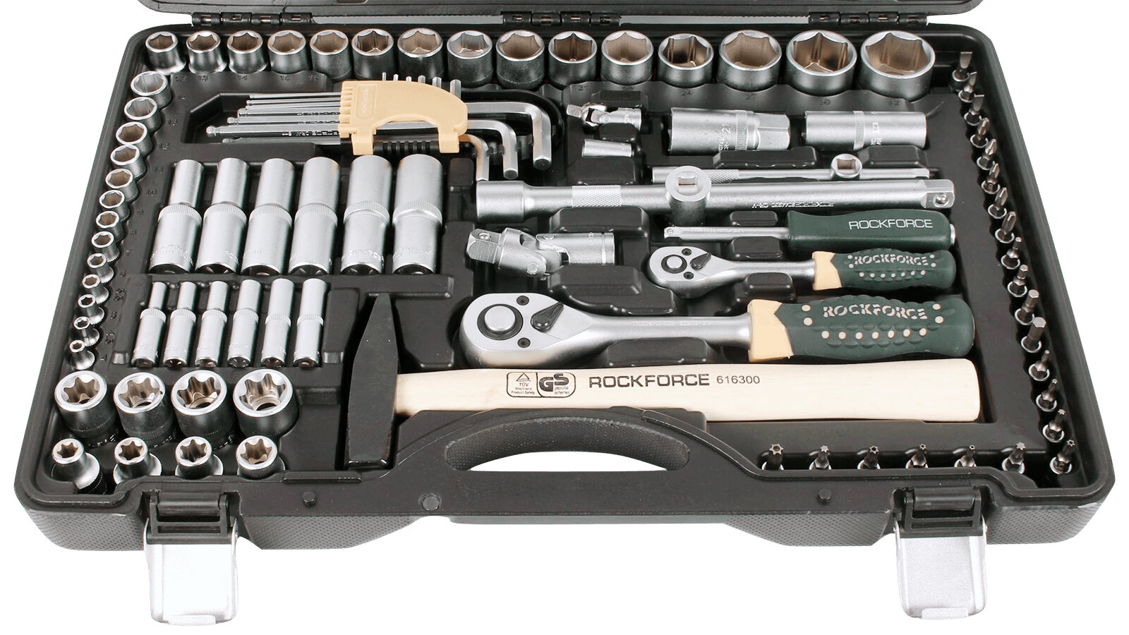 | Головки торцевые подробно | 1/2": 10, 11, 12, 13, 14, 15, 16, 18, 17, 19, 21, 20, 22, 24, 27, 30, 32, 36 мм; 3/8": 6, 7, 8, 9, 10, 12, 13, 14, 15, 16, 17, 19, 21 мм; 1/4": 6, 7, 8, 9, 10, 12, 13, 14 мм; длинные 1/2": 14, 15, 22 мм; длинные 3/8": 10, 12, 13, 14, 15, 17 мм; длинные 1/4": 6, 7, 8, 9, 10, 11, 12, 13 мм; Torx 1/2": E10, E12, E14, E16, E18, E20; Torx 1/4": E8, Е10, E12; трещотка 1/4", 1/2", 3/8"; вороток т-образный 1/2", 3/8", 1/4"; удлинитель 1/2": 125, 250 мм; удлинитель 3/8": 75, 150 мм; удлинитель 1/4": 50, 100 мм; свечные 1/2": 16, 18, 21 мм; вороток с шарниром 1/2"; гибкий удлинитель 1/4"; переходники: 1/4"(M)x3/8"(F), 3/8"(M)x1/2"(F) |
