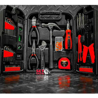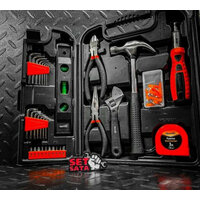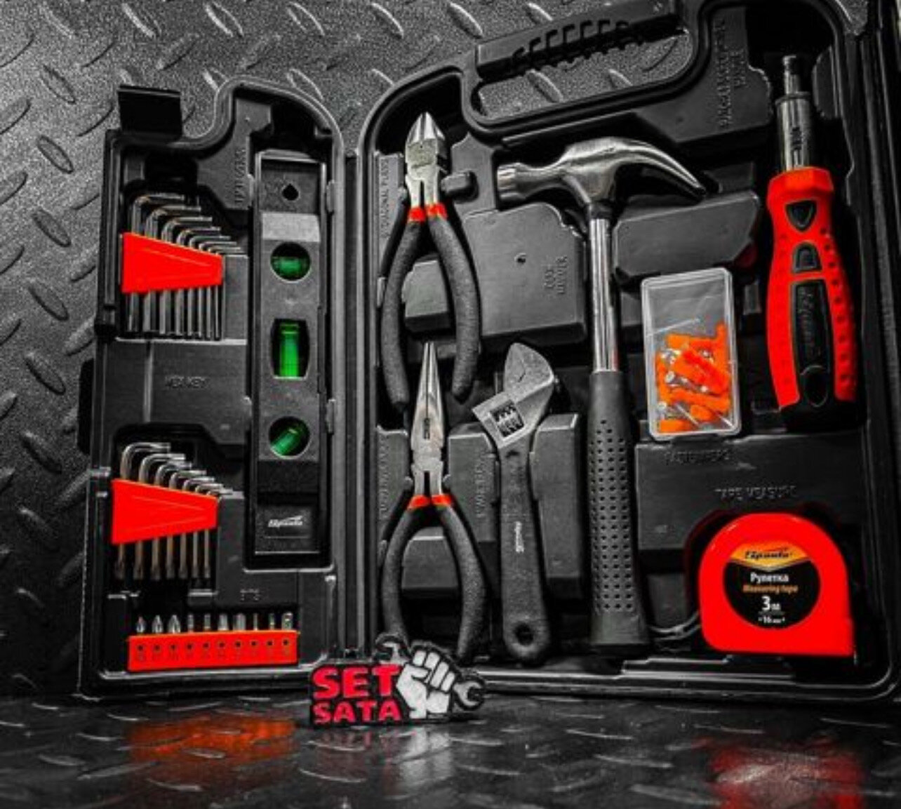 В набор входят обжимные клещи, отвертки, в том числе для точных работ, молоток-гвоздодер, бокорезы, строительный уровень, разводной и имбусовые ключи, биты-вставки с адаптером, длинногубцы, рулетка, канцелярский нож и набор крепежа.