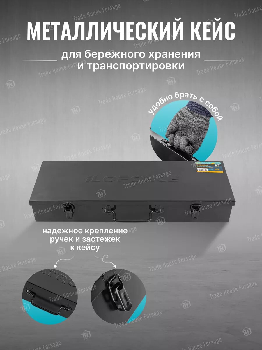 Набор инструментов ударных, 21 предмет от бренда ILOforce. Предназначен для работы с крепежными элементами в автомобильном ремонте, строительстве, промышленных процессах и других областях. Комплект включает ударные головки, трещотку, воротки и удлинители, изготовленные из высококачественной хромомолибденовой стали (Cr-MO), что обеспечивает их прочность и долговечность, а также позволяет работать с ударными инструментами.