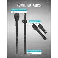 Комплектация: Ударные головки 6-гранные 3/4" (17, 19, 21, 22, 24, 27, 30, 32, 33, 34, 36, 36(12 гр.) 38, 41, 46, 50) мм, трещотка 3/4" 450 мм, удлинитель ударный 3/4" 200 мм, удлинитель ударный 3/4" 100 мм, вороток Т-образный 3/4" 450 мм.
