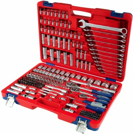 | Головки торцевые подробно | 1/2": 8, 9, 10, 11, 12, 13, 14, 15, 16, 17, 18, 19, 21, 22, 24, 27, 30, 32 мм; длинные 1/2": 13, 14, 17, 19, 22 мм; Torx 1/2": E10, E12, E14, E16, E18, E20, E22, E24; свечные 1/2": 14, 16 мм; удлинитель 1/2": 125, 250 мм; трещотка 1/2": 45 зубов; карданный шарнир 1/2"; 1/4": 4, 4.5, 5, 5.5, 6, 7, 8, 9, 10, 11, 12, 13 мм; длинные 1/4": 8, 10, 11, 12, 13 мм; Torx 1/4": E4, E5, E6, E7, E8; удлинитель 1/4": 75, 100 мм; трещотка 1/4": 45 зубов; вороток т-образный 1/4": 115 мм; карданный шарнир 1/4"; с битами 1/4": PH1, PH2, PZ1, PZ2, SL5.5, SL7, T8, T10, T15, T20, T25, T27, T30, H3, H4, H5, H6, H7 |