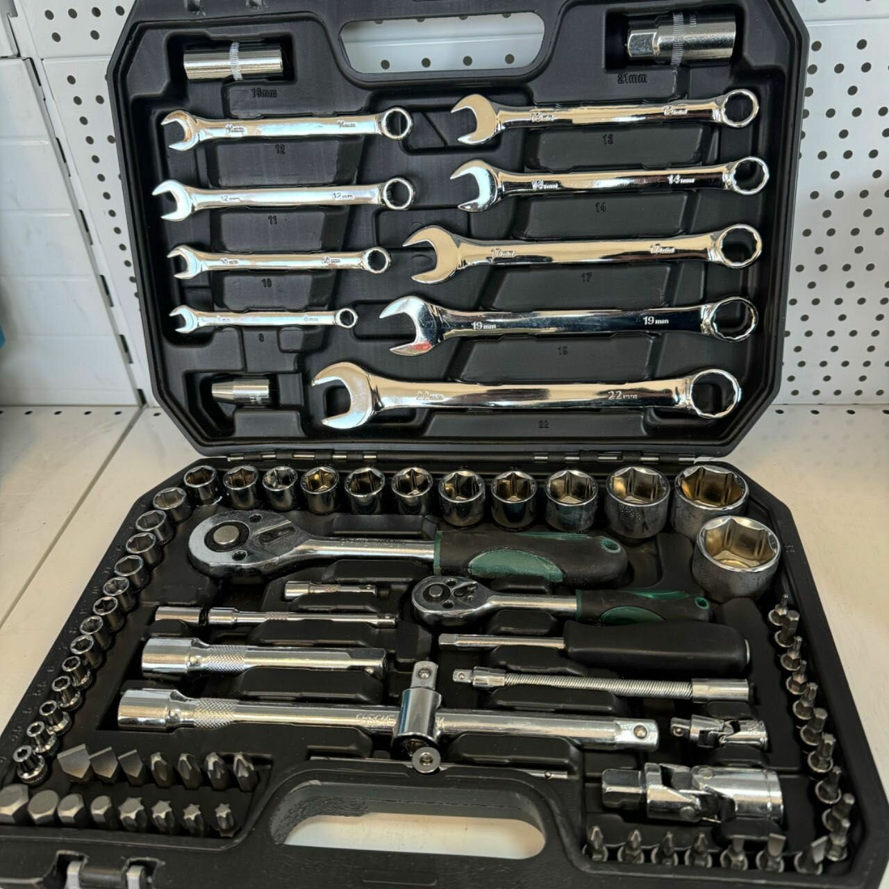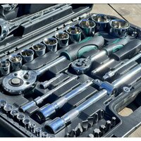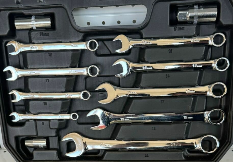 1 Кардан шарнирный ½ 1 Держатель ½ для бит 5/16 1 Держатель бит ¼ 1 Удлинитель ½ 125мм 9 Ключей комбинированных 8-10-11-12-13-14-17-19-22мм 12 Головок 6гр. ½ 14-15-16-17-18-19-20-21-22-24-27-30-32мм 2 Свечных головок ½ 16-21мм 1 Трещотка ½ 1 Трещотка ¼ 1 Кардан шарнирный ¼ 1 Вороток ¼ Т-образный скользящий 1 Удлинитель ¼ гибкий 150мм 1 Удлинитель ½ 250мм 1 Адаптер 3/8 -1/2 1 Рукоятка ¼ 2 Удлинителя ¼ 50-100мм 13 Головок 6гр. ¼ 4-4.5-5-5.5-6-7-8-9-10-11-12-13-14мм 4 Биты 5/16 6гр.8-10-12-14мм L-30мм 4 Биты 5/16 TORX T40-T45-T50-T55 L30мм 3 Биты 5/16 SL 8-10-12мм L-30мм 2 Биты 5/16 PH3-PH4 L-30мм 2 Биты 5/16 PZ3-PZ4 L-30мм 4 Головки биты ¼ 6гр. 3-4-5-6мм 3 Головки биты ¼ SL 4-5.5-7мм 6 Головок бит ¼ TORX T8-T10-T15-T20-T25-T30 2 Головки биты ¼ PH1-PH2 2 Головки биты ¼ PZ1-PZ2