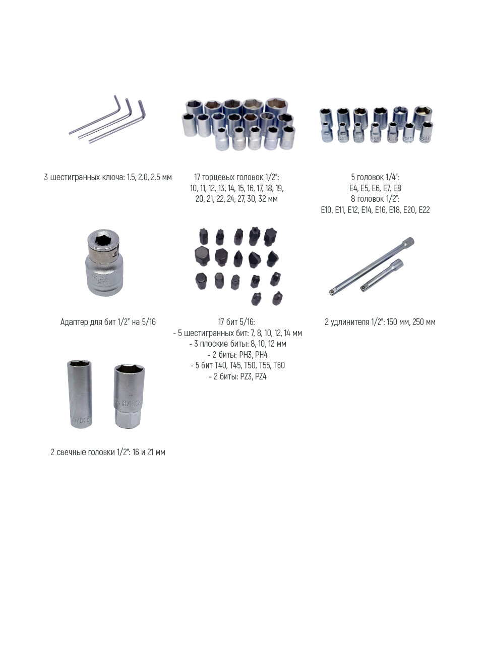 Torx (T/TX), крестообразный (PH), крестообразный (PZ), прямой (SL), шестигранный (H/HEX)