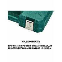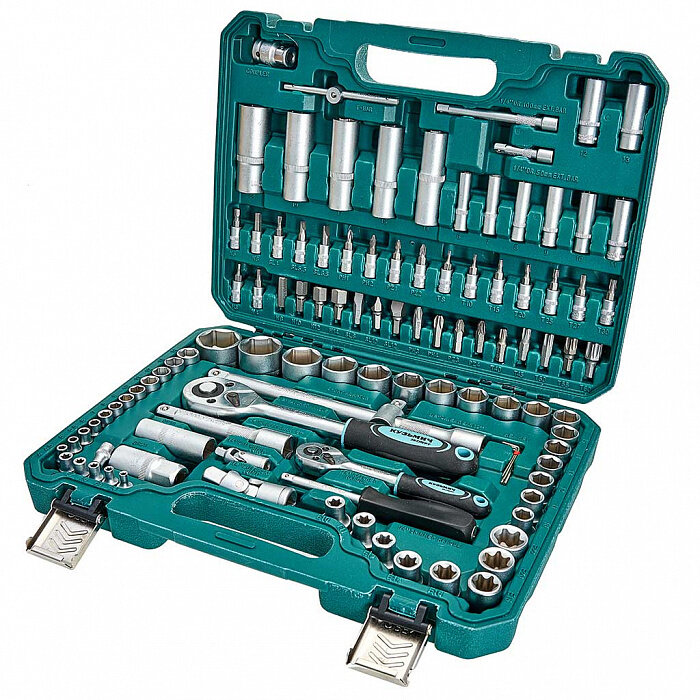 | Ручной инструмент подробно | удлинитель 1/4": 50, 100 мм – 2 штуки; рукоятка реверсивная (трещотка) 1/4" с функцией быстрого сброса – 155 мм, храповый механизм с 45 зубьями, рабочий угол 8° – 1 штука; рукоятка для торцевых головок 1/4" – 1 штука; шарнир универсальный 1/4" – 1 штука; вороток Т-образный 110 мм – 1 штука; рукоятка реверсивная (трещотка) 1/2" с функцией быстрого сброса – 250 мм, храповый механизм с 45 зубьями, рабочий угол 8° – 1 штука; удлинитель 1/2": 125, 250 мм – 2 штуки; адаптер 3-сторонний 1/2" – 1 штука; шарнир универсальный 1/2" – 1 штука; ключи шестигранные: 1.27, 1.5, 2, 2.5 мм |