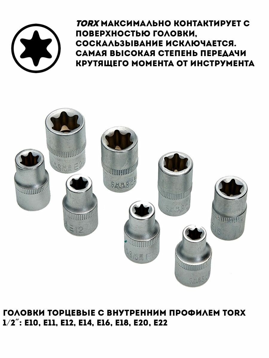 | Головки торцевые подробно | головки торцевые шестигранные 1/4" с замком: 4, 4.5, 5, 5.5, 6, 7, 8, 9, 10, 11, 12, 13, 14 мм – 13 штук; головки торцевые удлиненные 1/4" с замком: 6, 7, 8, 9, 10, 11, 12, 13 мм – 8 штук; головки торцевые с внутренним профилем TORX 1/4": E4, E5, E6, E7, E8 – 5 штук; головки торцевые со вставкой 1/4" 18 штук: HEX: 3, 4, 5, 6 мм, TORX: T8, T10, T15, T20, T25, T27, T30, SL: 4, 5.5, 6.5 мм, PH1, PH2, PZ1, PZ2, головки торцевые шестигранные 1/2" с замком: 10, 11, 12, 13, 14, 15, 16, 17, 18, 19, 20, 21, 22, 24, 27, 30, 32 мм – 17 штук; головки торцевые удлиненные 1/2" с замком: 14, 15, 17, 19, 22 мм – 5 штук; головки торцевые с внутренним профилем TORX 1/2": E10, E11, E12, E14, E16, E18, E20, E22 – 8 штук; головки торцевые свечные 1/2" – 16, 21 мм – 2 штуки |