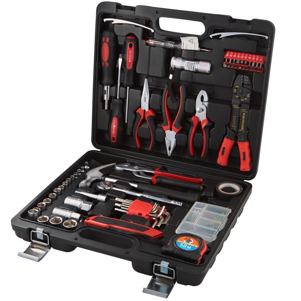 | Ручной инструмент подробно | Набор ручного инструмента содержит все необходимые инструменты и приспособления для выполнения разнообразных ремонтных работ В набор входит: комбинированные щипцы 150мм острогубцы 150 мм плоскогубцы регулируемые 200 мм универсальные клещи 150мм клещи обжимные фонарик светодиодный (батарейки в комплект не входят) отвертка индикаторная(тестер) 220 В молоток 2,27 кг набор шестигранных ключей 1.5-10мм 20 бит: T15-25-30, H3-4-5-6, S1-2-3-4-5-6, PH1-2-3, PZ1-2-3 переходник для бит 1/4” набор крепежа рулетка 5м х19мм изолента трещотка 3/8" 10 торцевых головок 1/4”: 4, 5, 6, 7, 8, 9, 10, 11, 12, 13 мм 6 торцевых головок 3/8”: 11, 13, 14, 15, 17, 19 мм переходник 3/8"-1/4' 3/8" ключи для свечей зажигания 16-21 мм удлинитель 3/8" х 70мм рукоятка для бит с трещоткой право/лево отвертка крестовая 6x100 мм отвертка шлицевая 6x100 мм съемники сервисный нож |