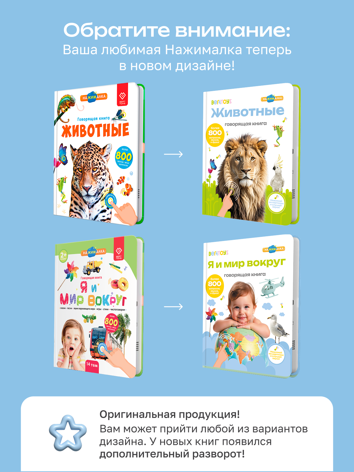 "Нажималка Я и Мир вокруг" знакомит детей с окружающим миром, первыми предметами, игрушками, животными и транспортом. "Нажималка Животные" содержит более 800 звуков, фраз и забавных заданий, которые помогут малышам узнать много интересного о мире животных.