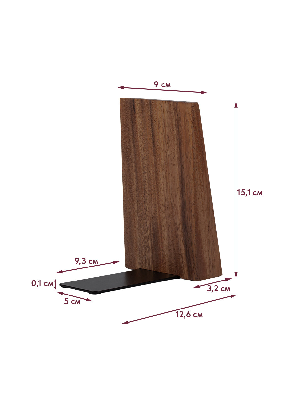 Ограничители или же подставки - отличные помощники в организации пространства и хранения книг, учебников и журналов не только дома, но и в библиотеке, офисе, за рабочим или учебным столом в любом помещении. Изделие выполнено из дерева акации (acacia) и в каждом наборе дополнительно идет комплект из 8 противоскользящих накладок, которые можно прикрепить к нижней части подставок - по 4 единицы на изделие. Железная опорная конструкция выступает от подставки на 9,3 см.