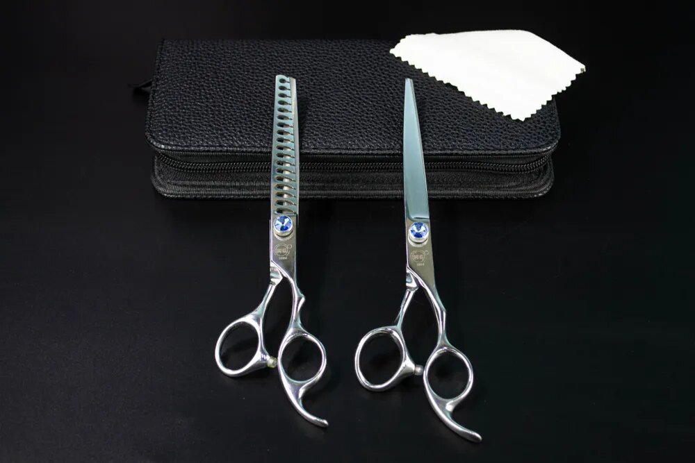 Набор из 2-х ножниц в чехле MOON BASE JA-3004 — идеальный выбор для профессиональных грумеров и начинающих мастеров. Ножницы изготовлены из высококачественной стали, что гарантирует их долговечность и остроту. Удобные ручки обеспечивают комфорт во время работы.