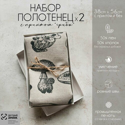 Набор полотенец кухонных, подарочных 2 шт. 56х40см с рисунком "грибы" +однотонное - это отличный выбор для вашей кухни. Этот набор включает в себя два кухонных полотенца, каждое размером 56х40 сантиметров. Они являются идеальным решением для уборки, сушки посуды и общих кухонных задач.
