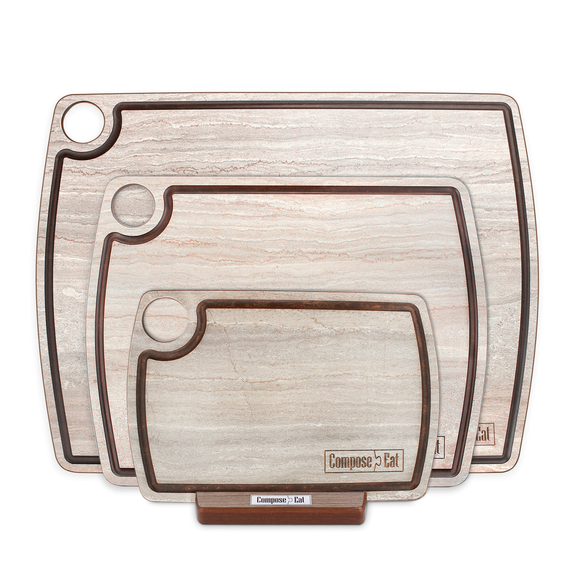 Артикул: NRD30406KL6. Классификатор : Разделочные доски. Классификатор : Разделочные доски. Материал разделочной доски : Бумажно-слоистый композит. Тип : Разделочные доски. Вес (г) : 1987. Страна изготовитель : Россия. Длина (см) : 38. Комплектация : Доска разделочная с желобом, размер 22х15см, травертин капучино Доска разделочная, c желобом, размер 29х22см, травертин капучино Доска разделочная, c желобом, размер 36х28см, травертин капучино Подставка для трех разделочных досок, размер 13х11 см, вяз Коробка подарочная ComposeEat, картон, размер 380х310х70 мм (ш*в*г). Компания производитель : ComposeEat, Россия. Модель / Семейство : Fashion Set 3. Ширина (см) : 31. Особенности разделочной доски : Желоб для удержания жидкости. Особенности разделочной доски : Долго сохраняет идеальный внешний вид. Особенности разделочной доски : Не впитывает влагу. Особенности разделочной доски : Не впитывает запахи. Особенности разделочной доски : Не затупляет режущую кромку ножа. Особенности разделочной доски : Не теряет форму. Особенности разделочной доски : Повышенная гигиеничность. Особенности разделочной доски : Повышенная термостойкость. Особенности разделочной доски : Повышенная ударопрочность. Особенности разделочной доски : Устойчивость к повреждениям. Тип разделочной доски : Классическая разделочная доска. Форма разделочной доски : Прямоугольная. Количество предметов в наборе : 4. Высота (см) : 7. Тип разделочной доски : Набор разделочных досок. Цвет : Травертин капучино. ComposeEat – молодой, но уже известный российский бренд. Компания занимается изготовлением уникальной продукции из инновационного материала – композита на основе бумаги. В коллекции бренда входят разнообразные модели разделочных досок. Благодаря применению технологий последнего поколения удалось разработать настолько плотную по текстуре массу, что она легко справляется с самыми интенсивными нагрузками. Уникальное покрытие даже после взаимодействия с остро заточенным кухонным ножом остается целым и сохраняет поверхности. В современной кулинарии существует тенденция использования разделочных досок в качестве сервировочных. Внедренная запатентованная технология, помогла придать изделиям полное сходство с текстурой натуральной древесины: ореха, бука, дуба, что станет идеальным фоном для закусок, сырной или мясной нарезки. Разделочные доски ComposeEat шикарно выглядят и обладают полным набором превосходных эксплуатационных качеств. Компания ComposeEat производит широкий ассортимент кухонных аксессуаров. Это изделия высокого качества, которые полностью отвечают всем требованиями системы сертификации наноиндустрии. Кухонные доски выполнены из монолитного материала на основе многослойной крафтовой бумаги. Это безопасный и экологичный продукт, рекомендованный к использованию в быту, медицинских и детских учреждениях. Разделочные доски ComposeEat прочные, легкие, термостойкие, не подвержены деформации, защищены гипоаллергенным покрытием. Цена и широкая цветовая гамма этих замечательных досок – еще одно очень весомое преимущество! Разделочная доска ComposeEat, сохраняющая остроту ножей, необходима на каждой кухне для решения различных кулинарных проблем. Она не впитывает запахи от ароматных продуктов благодаря плотной и непористой структуре, обладает антимикробным и антигрибковым эффектом, что препятствует размножению б