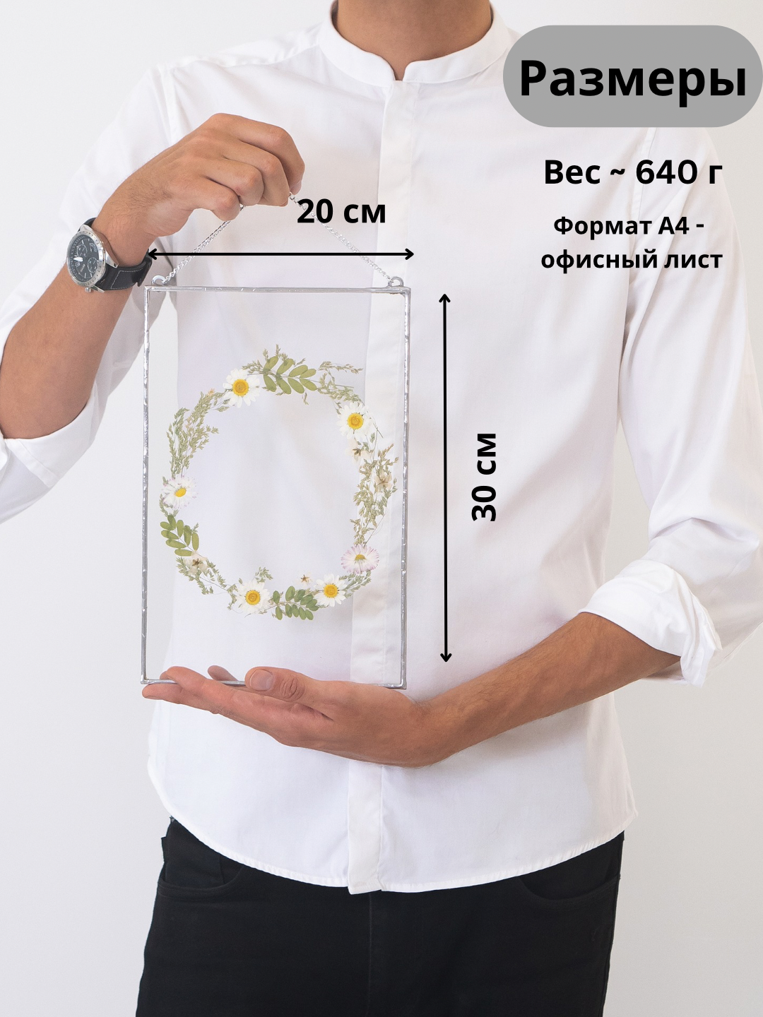 Состав: засушенные цветы (кермек, лаванда, житняк, гипсофила, гортензия, овес, луговые травы, белая статица), премиальное стекло, рамка из олова, цепочка