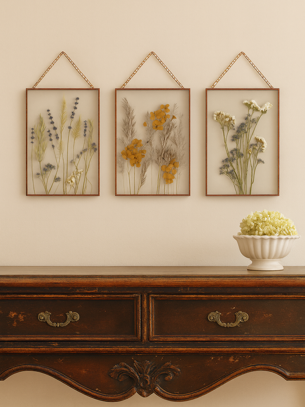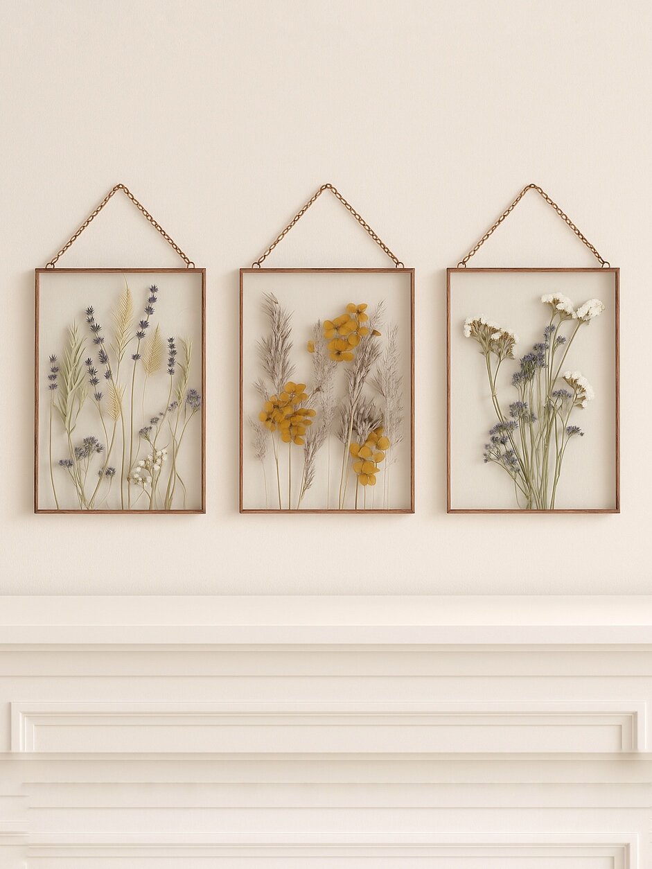 Эстетичный набор из трёх настенных панно с настоящими засушенными цветами, злаками и полевыми травами, вручную собранными и оформленными в тонкие стеклянные рамки в стиле лофт и slow living.