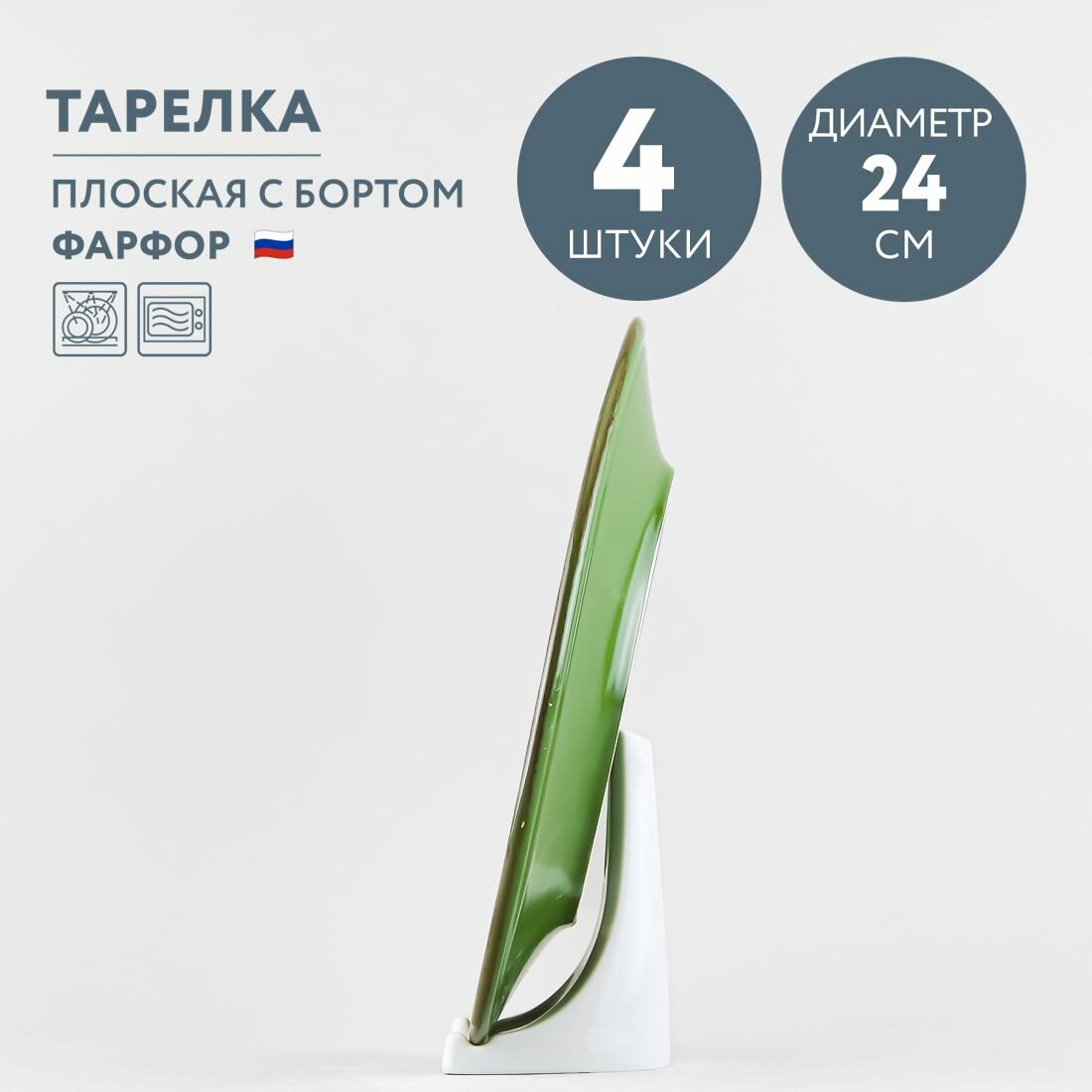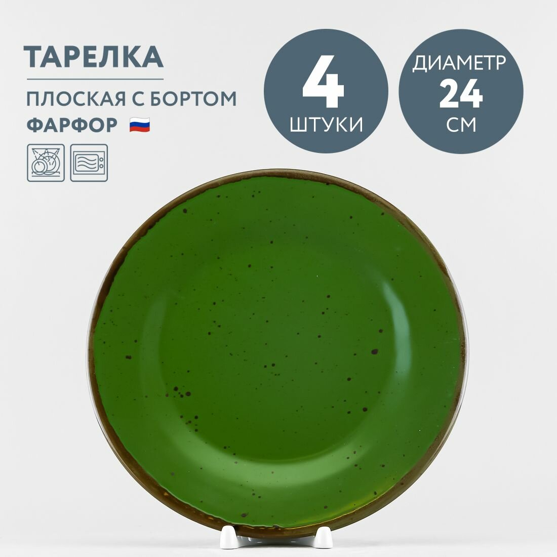Тарелка имеет плоскую круглую форму с широким бортиком и подходит для горячих блюд. Ее также можно использовать в качестве подстановочной тарелки для тарелки меньшего диаметра. Диаметр тарелки - 24 см, высота - 2 см.