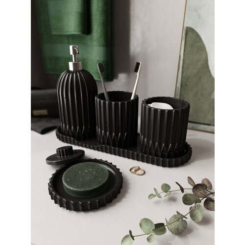 Набор из 5-и предметов, дозатор, мыльница, стакан для зубных щеток, стакан для ватных палочек, поднос, черный глянцевый