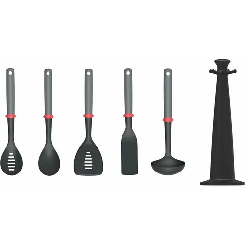 Набор незаменимых кухонных инструментов с удобной подставкой-каруселью. В набор входит лопатка для переворачивания и сервировки продуктов, универсальная ложка для перемешивания во время приготовления, ложка-шумовка, половник, универсальная лопатка. Ручки инструментов оснащены специальной подножкой, чтобы лопатки и ложки держались на весу, благодаря чему испачканная часть не коснется рабочей поверхности. Все аксессуары входят в серию кухонных приборов DUO, разработанную для поддержания максимального порядка во время приготовления блюд.