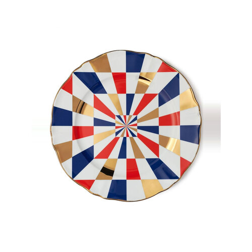 Белый, красный, синий, золотистый, фарфор, геометричный принт, асимметричные края и набор из двух предметов.