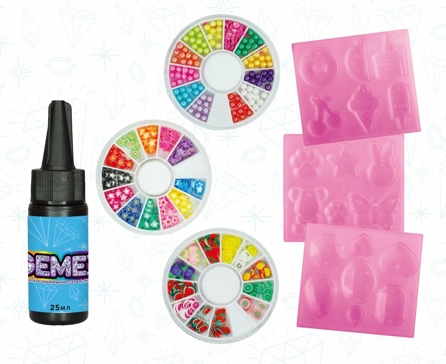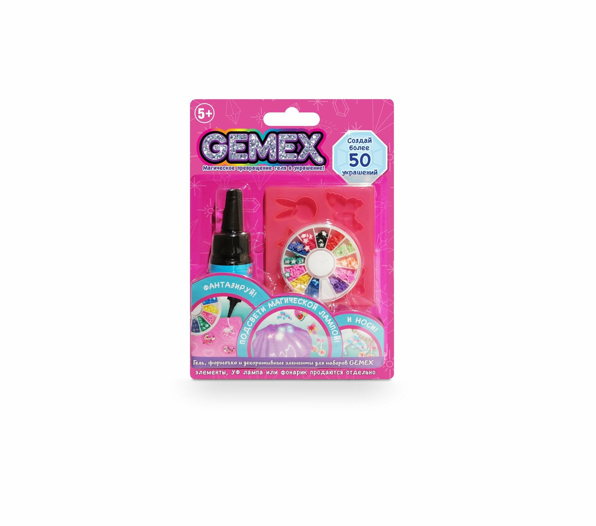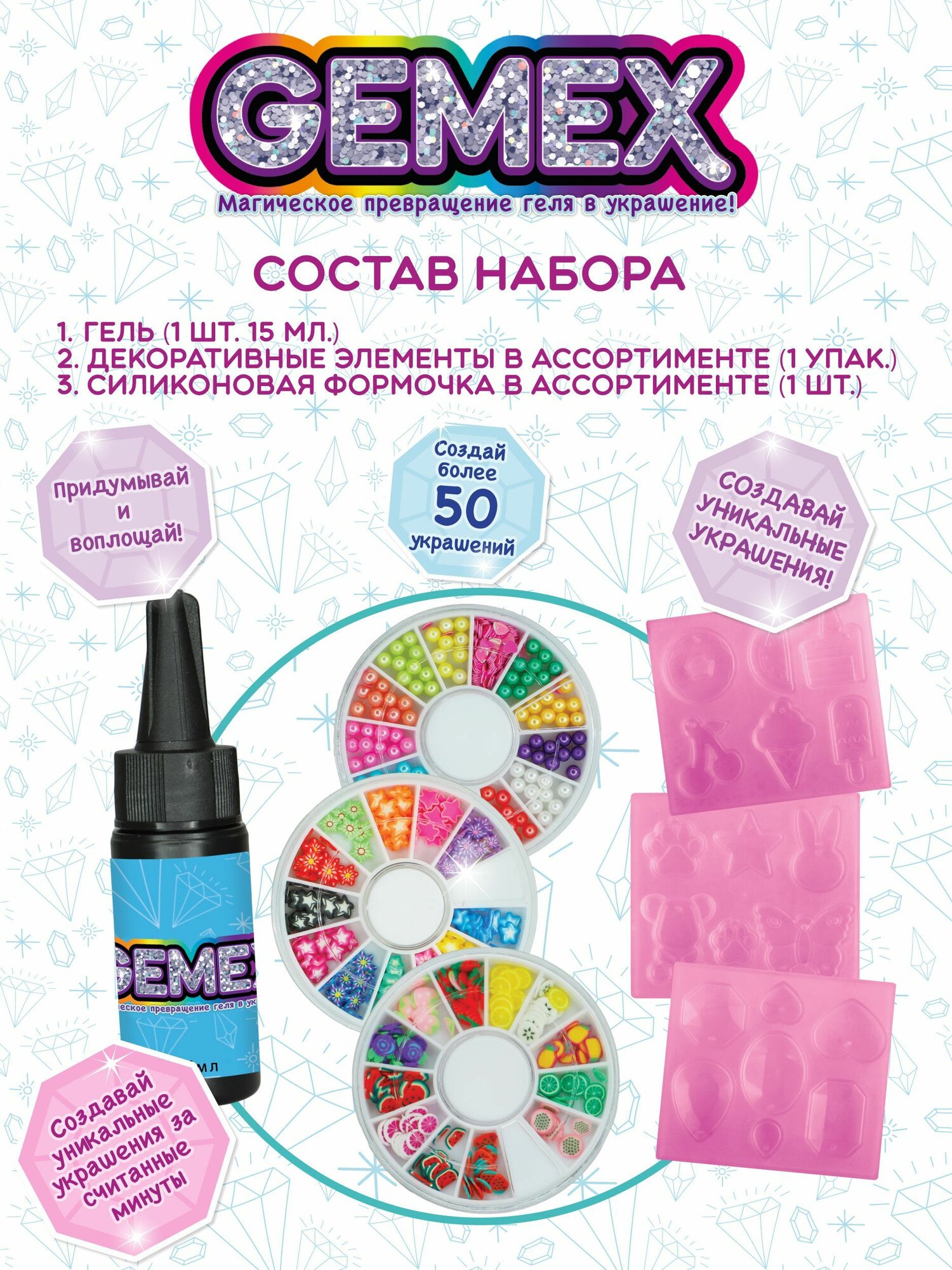 Набор GEMEX из геля, декоративного наполнителя и формочек для создания украшений GEMEX - это ваш творческий компаньон, который позволяет вам создавать собственные уникальные дизайны украшений. С легкостью воплощайте свои идеи в реальность и создавайте стильные и модные аксессуары.