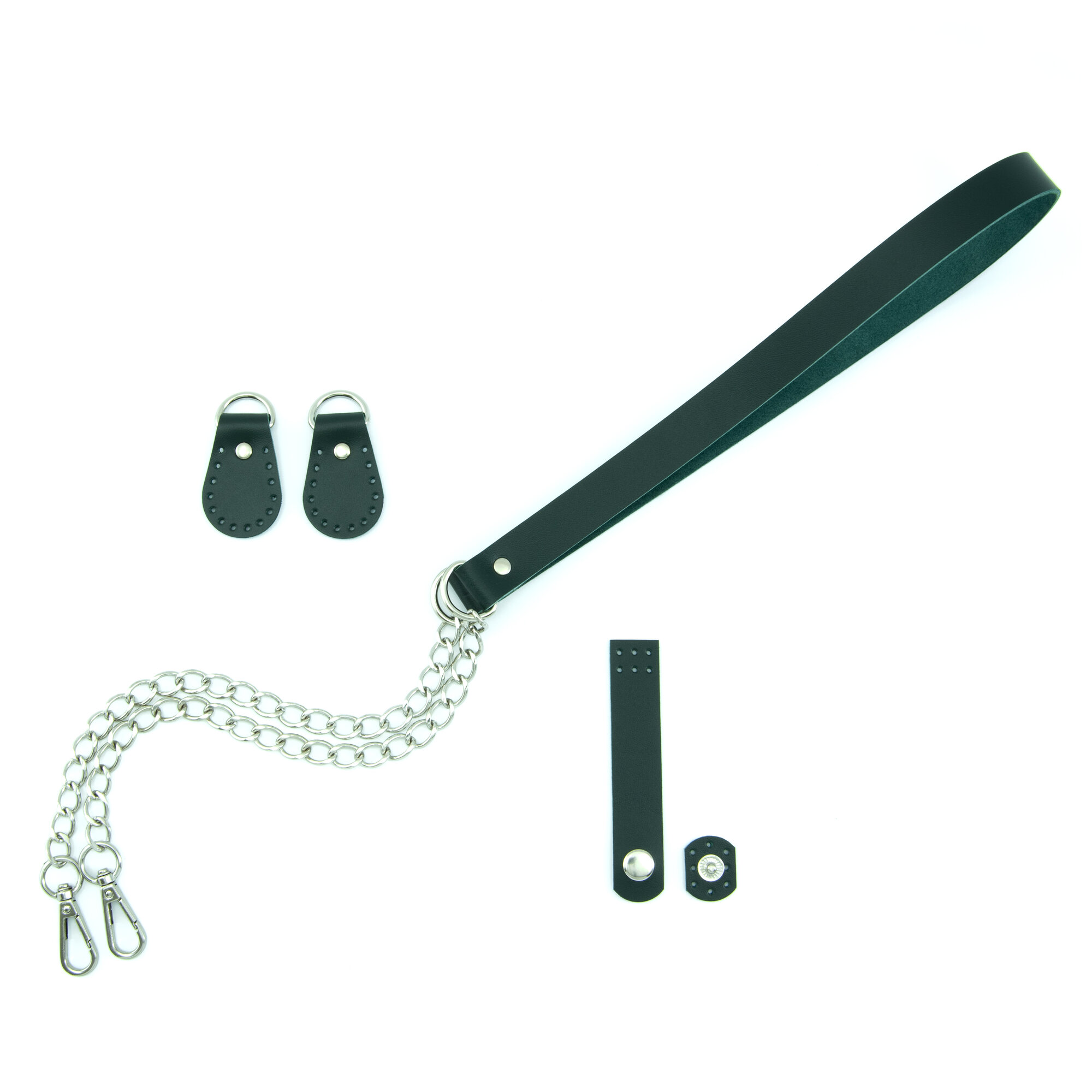 Купить Набор из натуральной кожи для вязаной сумки: комбинированный ремень, боковушки и застежка, цвет — зеленый с доставкой по всей России.