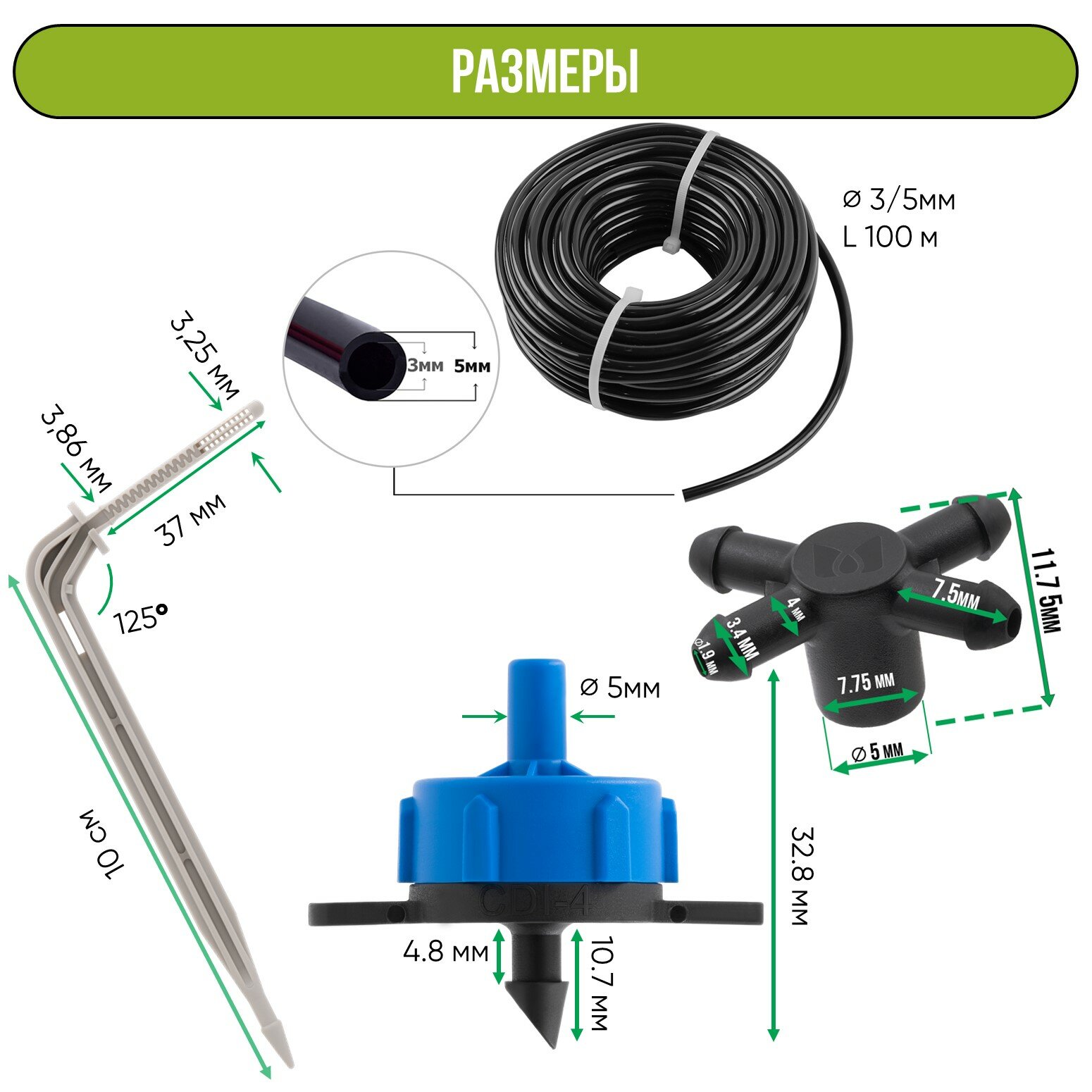 1. Микротрубка ПВХ 3/5 мм - 100 м; 2. Капельница компенсированная 8л/ч (синяя) - 50 шт; 3. Разветвитель на 4 выхода для трубки ПВХ 3/5мм - 50 шт; 4. Капельница для полива, колышек Г-образная, 2.2 л/ч - 200 шт; 5. Дырокол для капельниц - 1 шт;