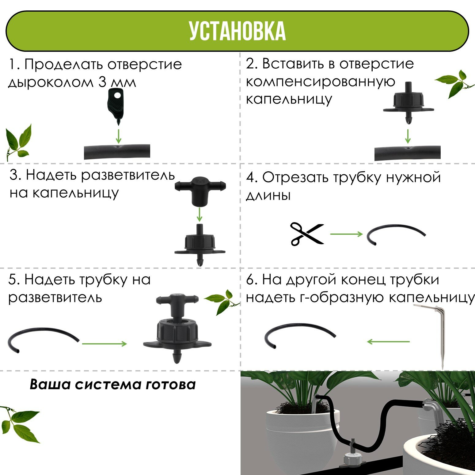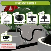 Набор включает в себя: -Микротрубка 3х5мм - 20м; -Капельница компенсированная 4л/ч (черная) - 20 шт; -Разветвитель на 2 вых 5мм для микротрубки - 20 шт; -Капельница-колышек Г-образная - 40 шт; -Дырокол для капельниц - 1 шт;