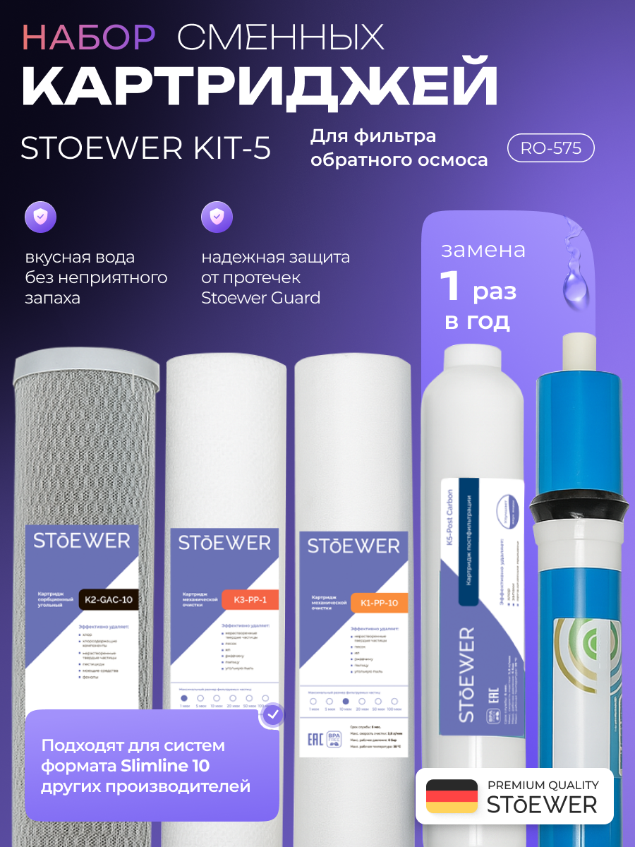 Купить Набор картриджей для фильтров обратного осмоса STOEWER Kit-5 для RO-575 с мембраной с доставкой по всей России. Набор картриджей для фильтров обратного осмоса STOEWER Kit-5 для RO-575 с мембраной: сравнение цен, характеристики, фото, актуальное наличие и цены.