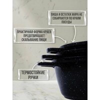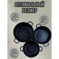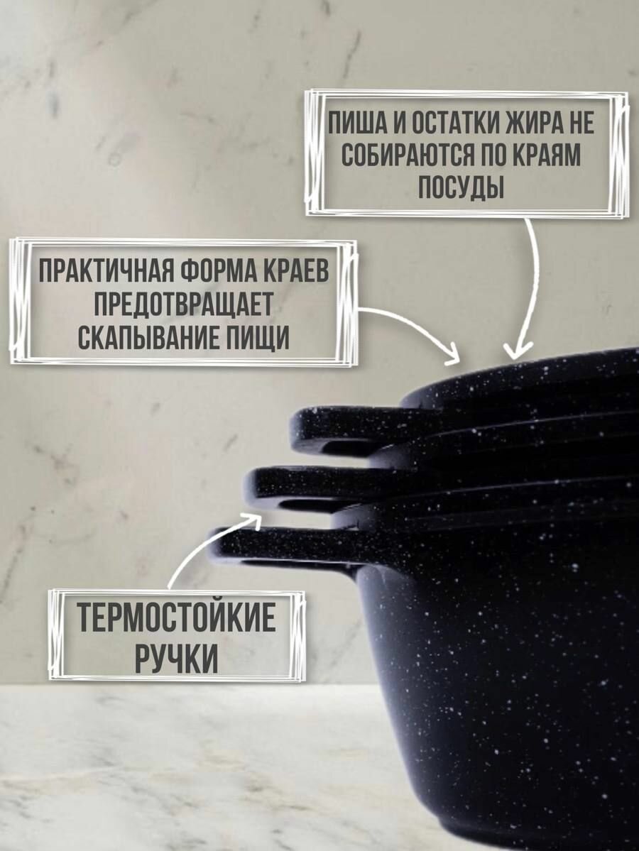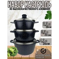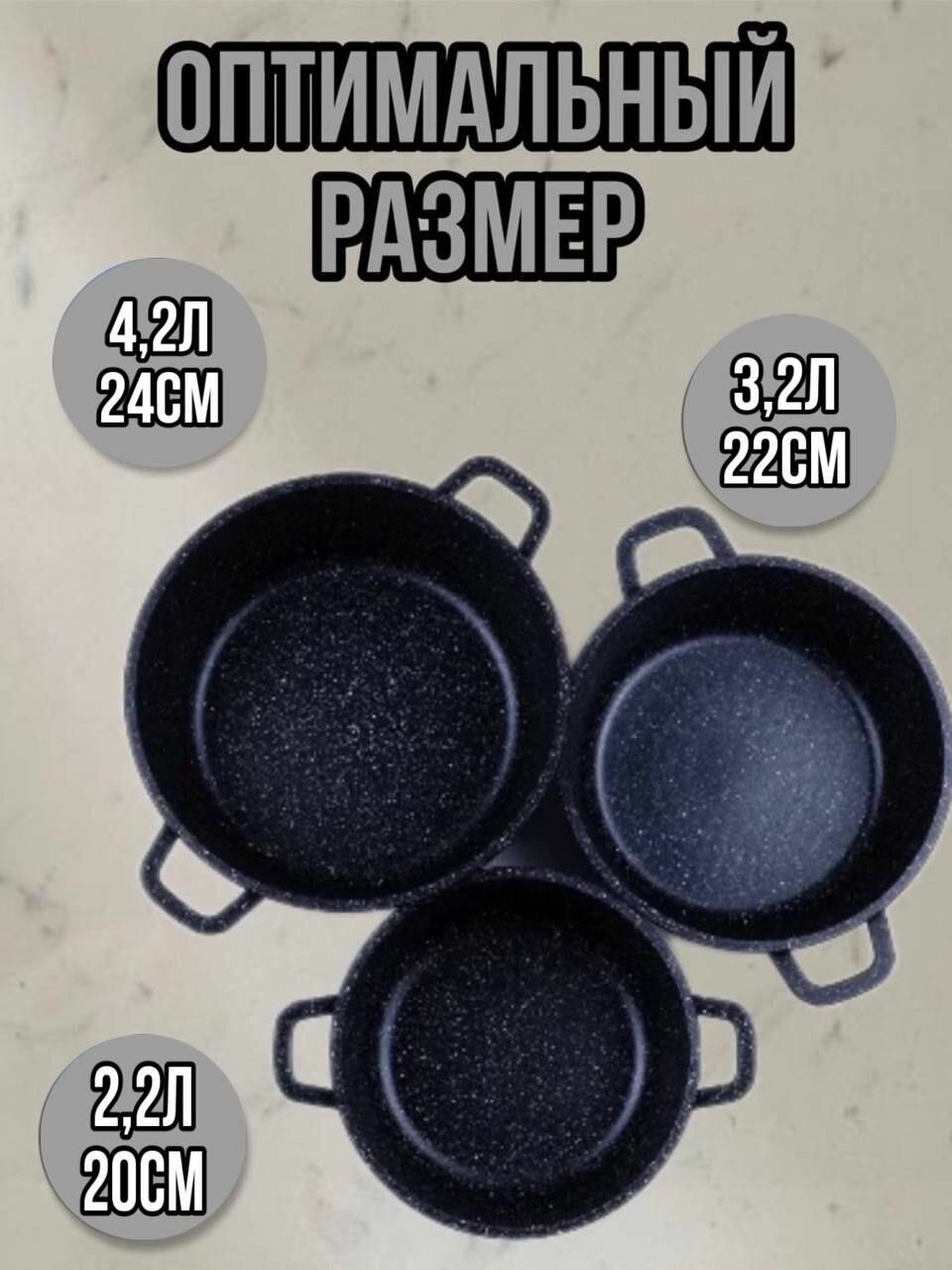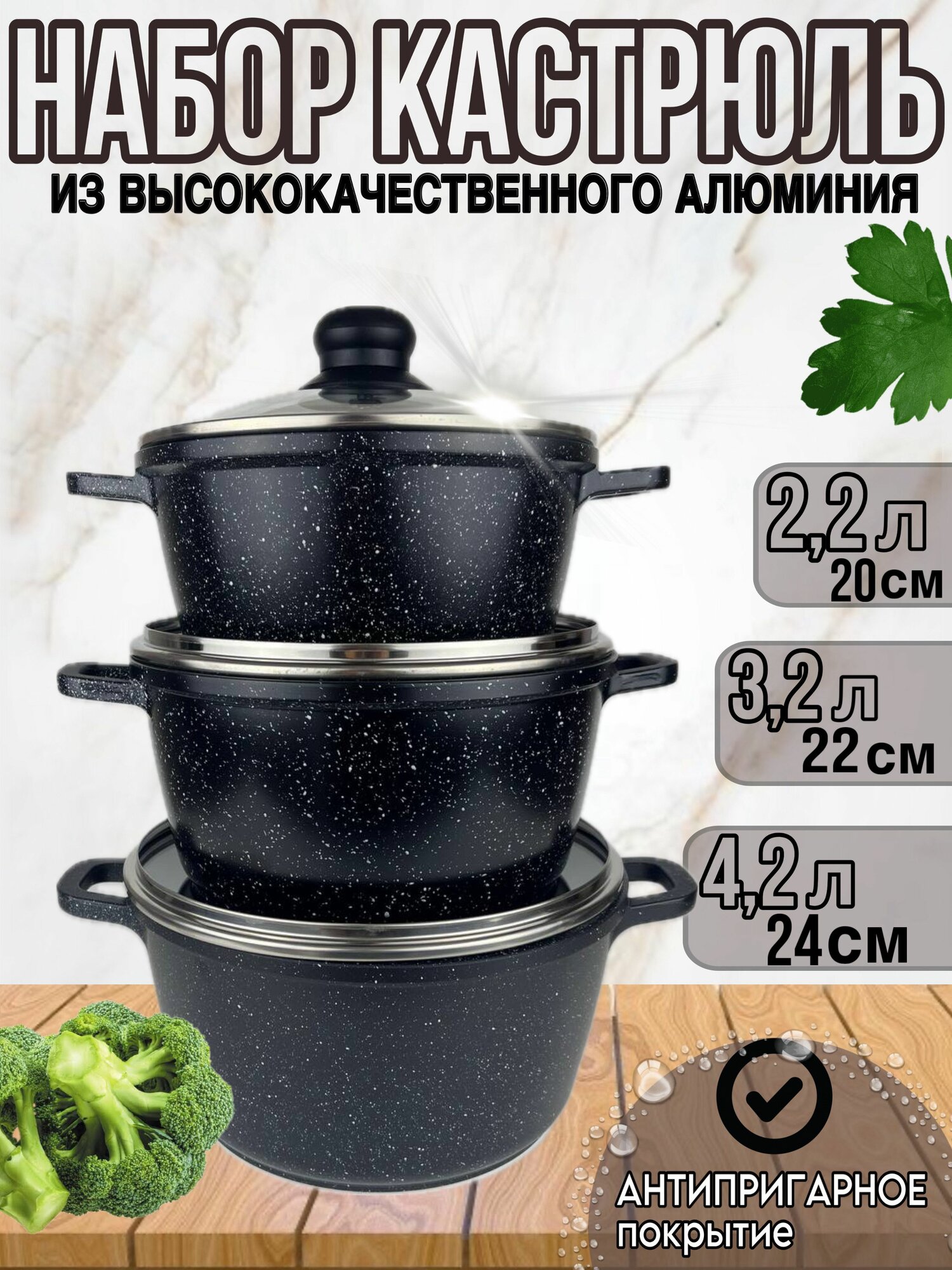 Этот набор кастрюль из высококачественного алюминия звучит очень функционально и удобно в использовании. Вот несколько основных преимуществ, которые можно выделить:1. Оптимальные размеры: 4.2 л, 3.2 л и 2.2 л — идеальный выбор для приготовления различных блюд в разных количествах.2. Практичная форма кромок: предотвращает скапывание пищи во время приготовления, что делает процесс более удобным и безопасным.3. Термостойкие ручки: обеспечивают безопасное перемещение кастрюль даже при высоких температурах.4. Семислойное капсульное дно: обеспечивает равномерное распределение тепла и быстрое нагревание, что помогает экономить время при готовке.5. Крышка из жаропрочного стекла с пароотводом и окантовкой из нержавеющей стали: позволяет контролировать процесс готовки, сохраняя влагу и аромат блюд, а также обеспечивает дополнительную прочность и долговечность. Эти особенности делают этот набор кастрюль отличным выбором для эффективной и удобной готовки разнообразных блюд.
