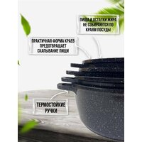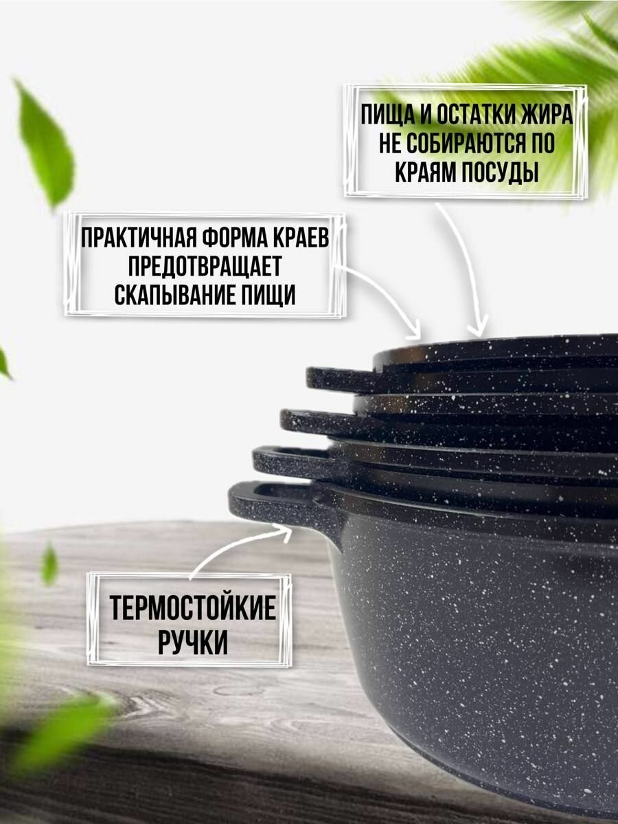 Этот набор кастрюль из высококачественного алюминия звучит очень функционально и удобно в использовании. Вот несколько основных преимуществ, которые можно выделить:1. Оптимальные размеры: 4.2л, 3.2 л, 2.2л и 1.8 л — идеальный выбор для приготовления различных блюд в разных количествах.2. Практичная форма кромок: предотвращает скапывание пищи во время приготовления, что делает процесс более удобным и безопасным.3. Термостойкие ручки: обеспечивают безопасное перемещение кастрюль даже при высоких температурах.4. Семислойное капсульное дно: обеспечивает равномерное распределение тепла и быстрое нагревание, что помогает экономить время при готовке.5. Крышка из жаропрочного стекла с пароотводом и окантовкой из нержавеющей стали: позволяет контролировать процесс готовки, сохраняя влагу и аромат блюд, а также обеспечивает дополнительную прочность и долговечность. Эти особенности делают этот набор кастрюль отличным выбором для эффективной и удобной готовки разнообразных блюд.