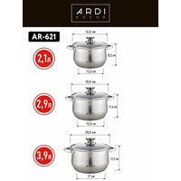 Благодаря разнообразию вариантов эти кастрюли могут стать отличным подарком на любой праздник. Приобретая набор AR-621, вы получаете не только качественную посуду для кухни, но и возможность наслаждаться процессом приготовления. Удобные не нагревающиеся ручки делают использование кастрюль комфортным. Закажите наш набор кастрюль уже сегодня и наслаждайтесь готовкой с удовольствием! Мы не только продаем эти прекрасные кастрюли, мы являемся производителем товаров бренда