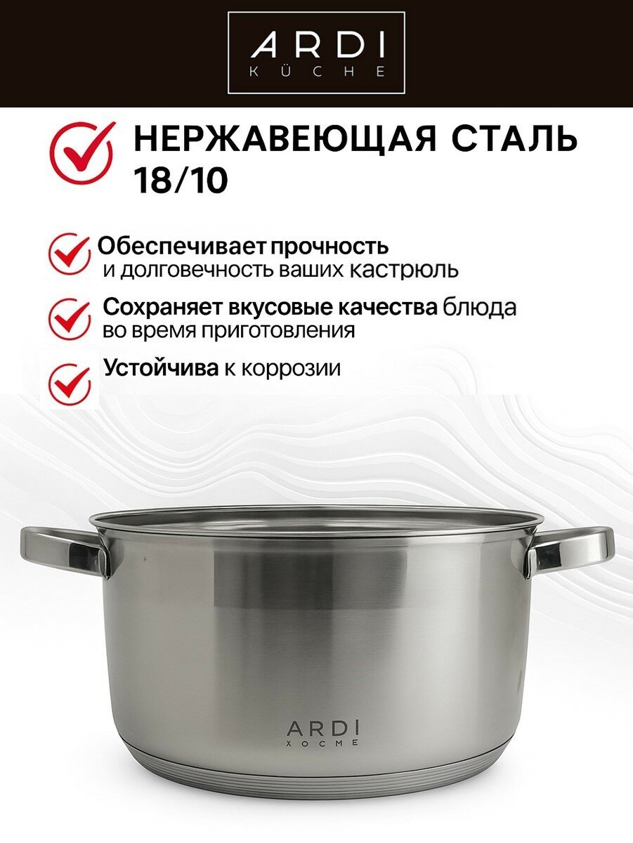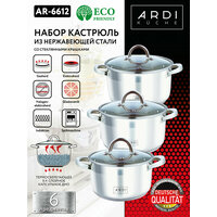 Набор кастрюль ARDI Küche AR-6612 (6 предметов) из высококачественной нержавеющей стали со стеклянными крышками. Станет незаменимым помощником на кухне для хозяек. Кастрюли имеют оптимальный объем 1,9л, 2,7л. и 3,6л. для приготовления наивкуснейших блюд для всей семьи. Удобный в применении набор кастрюль станет заметным предметом вашей кухни, который создаст уют, теплую атмосферу дома и на даче. Современная форма и лаконичный дизайн с сатиновой полировкой сочетается с любым интерьером и любой посудой. Благодаря капсульному дну быстро и равномерно нагревается. Хорошо подходит для варки, тушения и томления, и блюда в ней получаются
