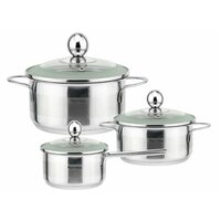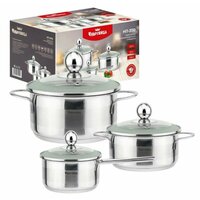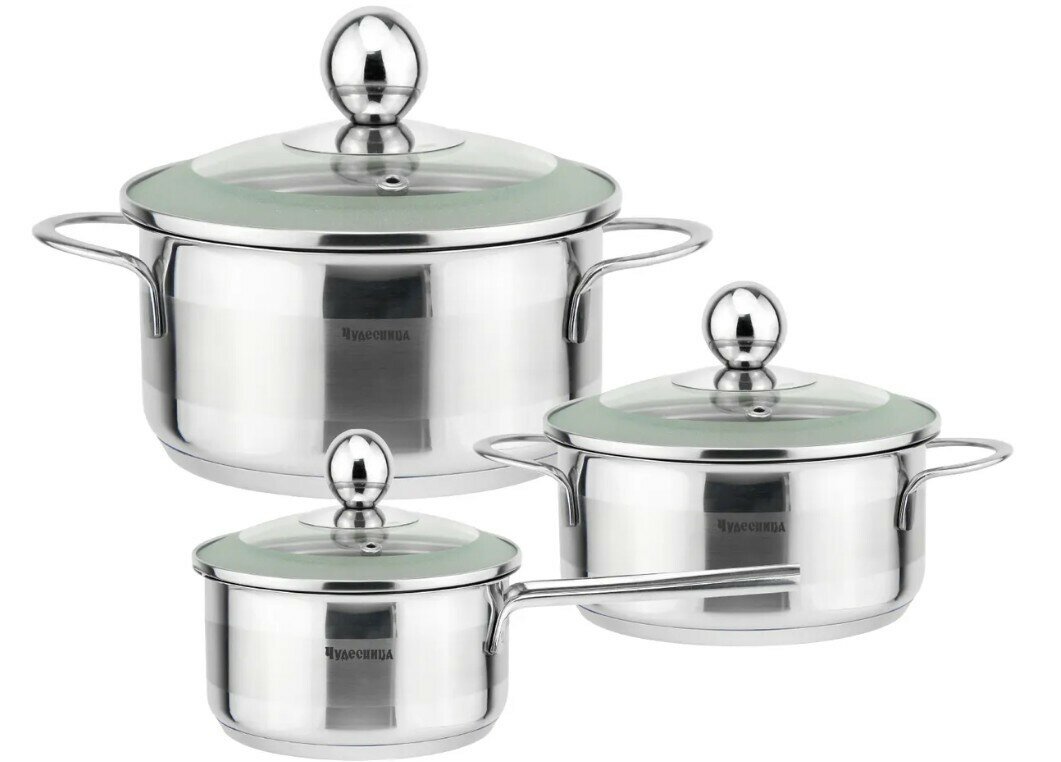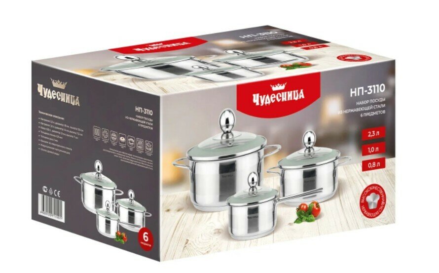 Набор посуды Чудесница НП-3110 включает в себя 2 кастрюли объемом 2.3 и 1 литра, и ковш объемом 0.8 литра. Кухонная утварь выполнена с использованием нержавеющей стали. Данный материал устойчив к появлению коррозийного налета, а также не подвержен утрате первозданного блеска на протяжении длительного времени. Все предметы, входящие в комплект Чудесница НП-3110, комплектуются крышками из закаленного стекла, на поверхности которого вы не отметите появление ни единого повреждения даже при постоянном воздействии высоких температурных значений. Специально предусмотренное отверстие способствует своевременному отводу пара, тем самым препятствуя выкипанию приготавливаемых соусов или первых блюд. Хозяйки по достоинству оценят наличие внутренней шкалы, позволяющей мгновенно наполнить посуду необходимым объемом жидкости.