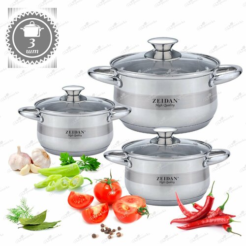 Набор кастрюль изготовлен из высококачественной нержавеющей стали – экологически чистого, долговечного материала, который чрезвычайно устойчив к коррозии и надолго сохраняет свои функциональные свойства. 3-х слойное термоаккумулирующее дно позволяет готовить с минимальным количеством воды и жира, или же совсем без них. Комбинированная полировка, матовая полировка внутри, крышки-стекло. В набор входят: кастрюля с крышкой Ø 16 см – 2,1 л; кастрюля с крышкой Ø 18 см – 3 л; кастрюля с крышкой Ø 20 см – 4 л. Подходит для всех видов плит, включая индукционную! Упаковка – подарочная коробка с пластиковой ручкой. Кастрюли с толстым дном изготовлены из высококачественной нержавеющей стали, экологически чистого, долговечного материала, который чрезвычайно устойчив к коррозии и надолго сохраняет свои функциональные свойства. Толщина дна кастрюли - 7 мм, толщина стенок - 1 мм. Трёхслойное капсулированное дно позволяет готовить с минимальным количеством воды и жира. Матовая полировка внутри и снаружи, крышки - стекло с металлической окантовкой. Преимущество данной посуды - это толстое многослойное дно, ненагревающиеся ручки. Крышка с металлическим ободком и пароотводом. Кастрюля мечта для хозяйки! Трёхслойное капсульное дно обеспечивает равномерное распределение тепла и быстрый нагрев содержимого, избегая пригорания пищи. Удобные ручки термокастрюли не скользят и не нагреваются в процессе приготовления пищи. Крышка из термостойкого стекла с отверстием для отведения пара выдерживает резкий перепад температур и обладает высокой термоустойчивостью. Посуда подходит для использования на любых типах плит, включая индукционные. Кастрюлю из нержавейки можно мыть в посудомоечной машине. Набор кастрюль для индукционной плиты невероятно удобны в использовании, за ними легко и просто ухаживать. Ненагревающиеся ручки позволяют сливать жидкость без использования прихваток, а стеклянная прозрачная крышка поможет вам наблюдать за процессом приготовления. Кастрюля с толстым дном надолго сохранит тепло ваших блюд. Набор наших кастрюль подходят для варки и тушения. Стеклянная посуда очень удобна для приготовления первых и вторых блюд, а так же для сезонных заготовок. Идеально подойдет вам как походная посуда. Посуда набор Zeidan станет самым лучшим подарком и помощником на вашей кухне. Соберите коллекцию кухонной и декоративной посуды в нашем магазине! У нас есть всё! Просьба обратить внимание, что на коробке и в описании указан заводской(общий) объем кастрюли, который отличается от рабочего(полезного) на +0,5 литров в зависимости от литража кастрюль. Просим это учитывать при покупке любых кастрюль и наборов. Посуда для дома поставляется в подарочной коробке, поэтому это будет отличный подарок подруге и родным по любому поводу. В нашем магазине вся посуда для кухни высокого качества, такая как кастрюля, сковорода или френч-пресс. У нас самый большой выбор красивой посуды для кухни и товаров для дома!