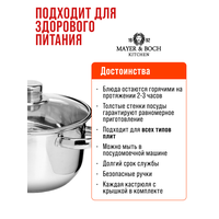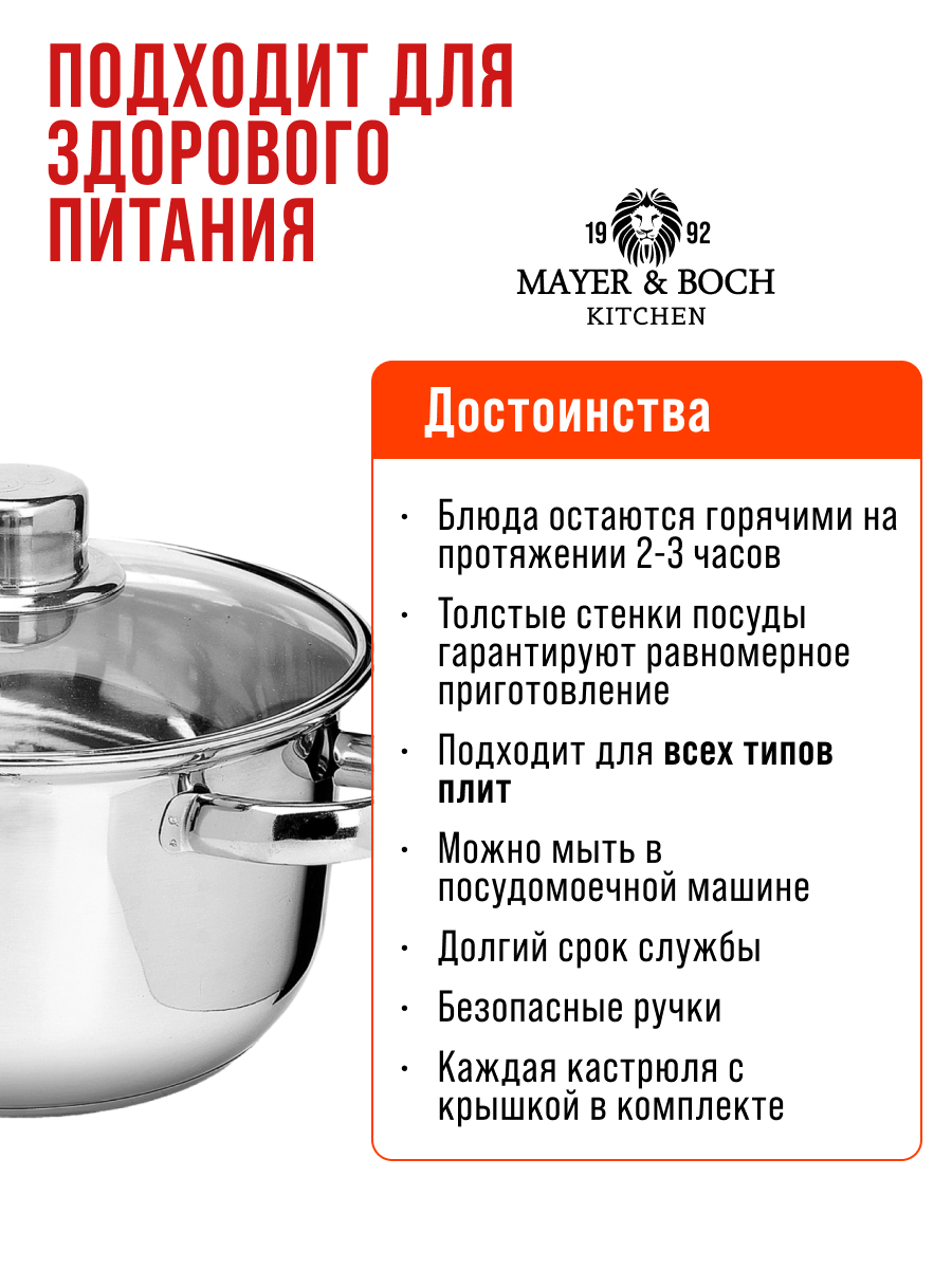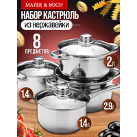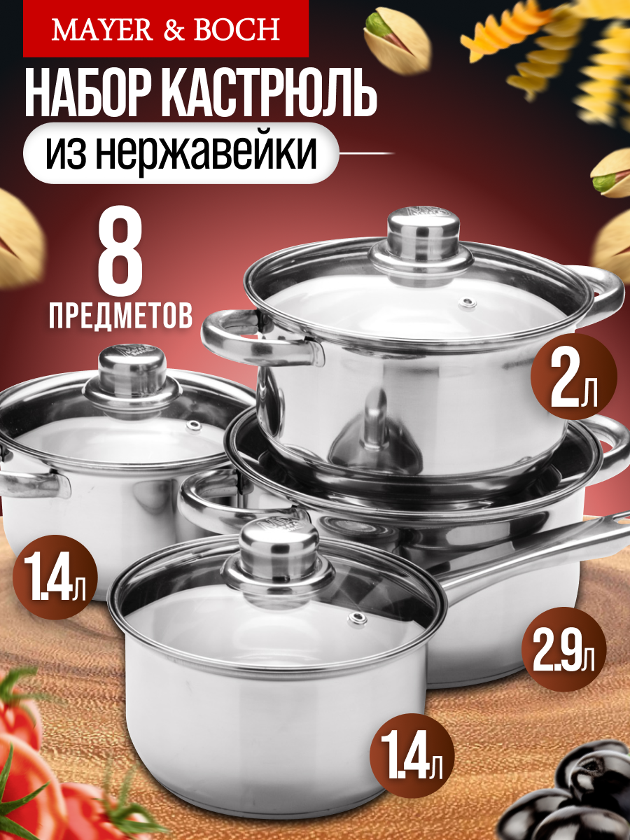 Набор кастрюль с крышкой Mayer-Boch из нержавеющей стали. Набор посуды из 8 предметов: ковш с ручкой 1,4л, кастрюля 1,4 л, кастрюля 2,0 л, кастрюля 2,9 л и 4 стеклянные крышки разного диаметра - это незаменимый предмет на любой кухне. Кастрюли имеют капсульное дно, которое быстро и равномерно нагревается; подходят для разных видов плит: газовые, электрические, кроме индукционной плиты. Отлично подходят для приготовления: супа, каши, овощей, макаронных изделий и других блюд. Кастрюли из высококачественной нержавеющей стали сочетает в себе долговечность, устойчивость к коррозии, прочность и функциональность. Комплект посуды нержавеющая благодаря элегантному дизайну подойдут к любому интерьеру. Это идеальный выбор для одного, двух или трех человек. В комплект входят стеклянные крышки с металлическим ободом и клапаном для выпуска пара. Оснащены удобными термостойкими клепаными ручками. Подходят для посудомоечных машин. Нельзя использовать в микроволновых (СВЧ) печах. Изделие Mayer-Boch будет прекрасным и функциональным и практичным подарком для вас, ваших близких и знакомых, которые готовят с удовольствием и украшают праздничный стол. Поможет вам определиться с подарком на Новый год, Рождество, День Рождения, 8 марта, День Святого Валентина, Новоселье и Свадьбу. Это универсальный и полезный подарок жене, маме, бабушке, друзьям. Красивая и стильная упаковка