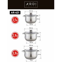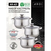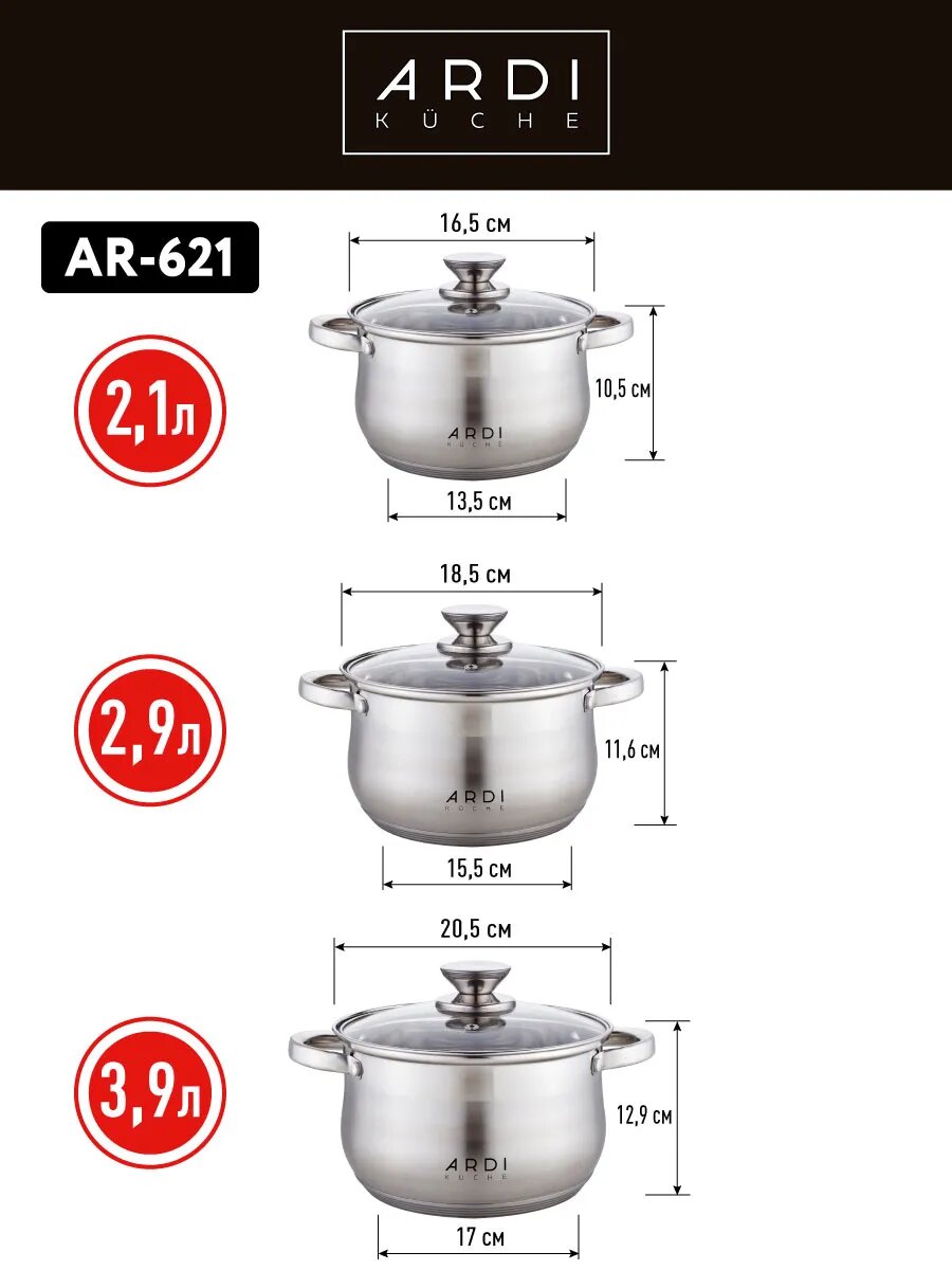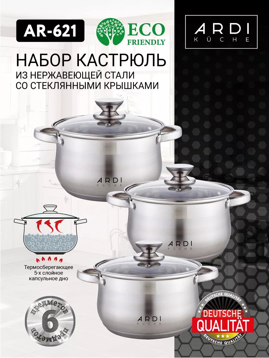 Набор кастрюль с крышкой Mayer-Boch из нержавеющей стали. Набор посуды из 6 предметов: кастрюля 2 л, кастрюля 2,5 л, кастрюля 3,0 л и три стеклянные крышки разного диаметра - это незаменимый предмет на любой кухне. Кастрюли имеют капсульное дно, которое быстро и равномерно нагревается; подходят для разных видов плит: газовые, электрические, индукционные и все остальные. Отлично подходят для приготовления: супа, каши, овощей, макаронных изделий и других блюд. Кастрюли из высококачественной нержавеющей стали сочетает в себе долговечность, устойчивость к коррозии, прочность и функциональность. Комплект посуды нержавеющая благодаря элегантному дизайну подойдут к любому интерьеру. Это идеальный выбор для одного, двух или трех человек. В комплект входят стеклянные крышки с металлическим ободом и клапаном для выпуска пара. Оснащены удобными термостойкими клепаными ручками. Подходят для посудомоечных машин. Нельзя использовать в микроволновых (СВЧ) печах. Изделие Mayer-Boch будет прекрасным и функциональным и практичным подарком для вас, ваших близких и знакомых, которые готовят с удовольствием и украшают праздничный стол. Поможет вам определиться с подарком на Новый год, Рождество, День Рождения, 8 марта, День Святого Валентина, Новоселье и Свадьбу. Это универсальный и полезный подарок жене, маме, бабушке, друзьям. Красивая и стильная упаковка