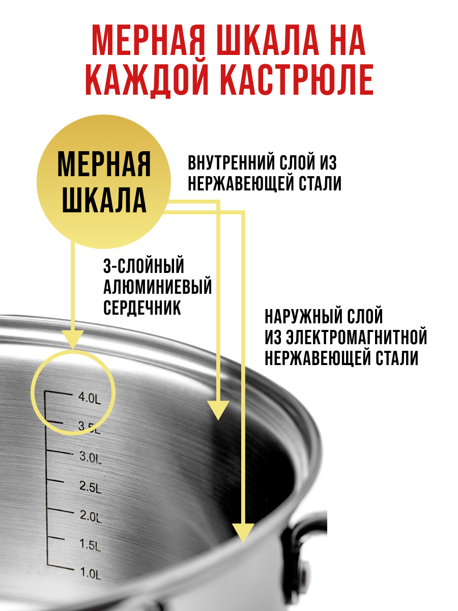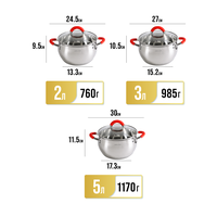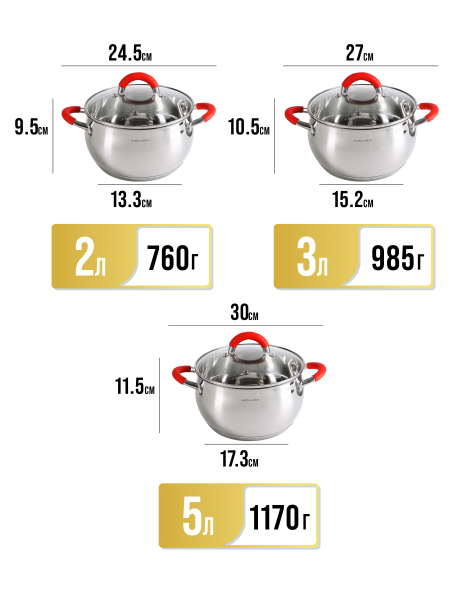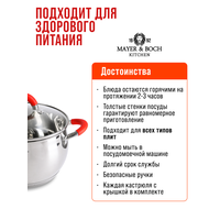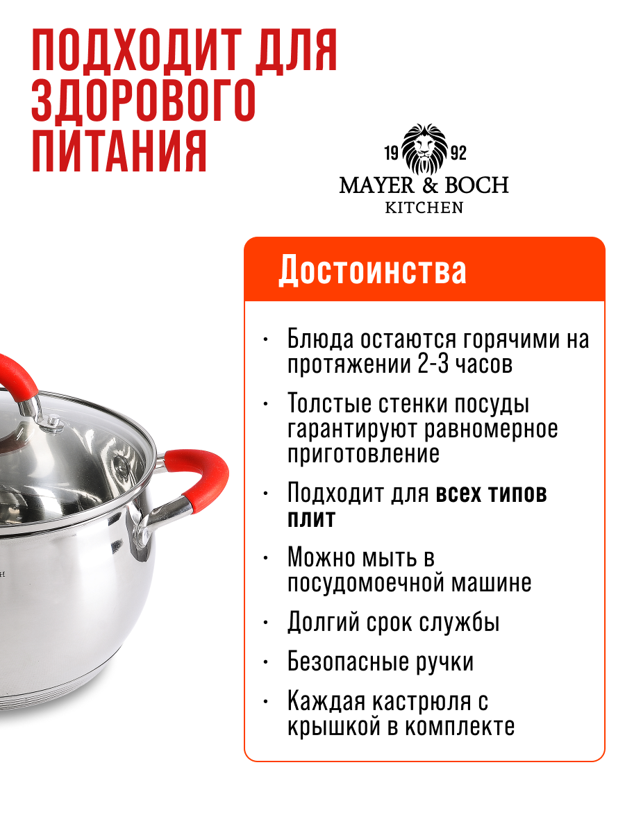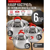 Набор кастрюль с крышкой Mayer-Boch из нержавеющей стали. Набор посуды из 6 предметов: кастрюля 1,5 л, кастрюля 2,5 л, кастрюля 3,0 л и три стеклянные крышки разного диаметра - это незаменимый предмет на любой кухне. Кастрюли имеют капсульное дно, которое быстро и равномерно нагревается; подходят для разных видов плит: газовые, электрические, индукционные и все остальные. Отлично подходят для приготовления: супа, каши, овощей, макаронных изделий и других блюд. Кастрюли из высококачественной нержавеющей стали сочетает в себе долговечность, устойчивость к коррозии, прочность и функциональность. Комплект посуды нержавеющая благодаря элегантному дизайну подойдут к любому интерьеру. Это идеальный выбор для одного, двух или трех человек. В комплект входят стеклянные крышки с металлическим ободом и клапаном для выпуска пара. Оснащены удобными термостойкими клепаными ручками с красной силиконовой отделкой. Подходят для посудомоечных машин. Нельзя использовать в микроволновых (СВЧ) печах. Изделие Mayer-Boch будет прекрасным и функциональным и практичным подарком для вас, ваших близких и знакомых, которые готовят с удовольствием и украшают праздничный стол. Поможет вам определиться с подарком на Новый год, Рождество, День Рождения, 8 марта, День Святого Валентина, Новоселье и Свадьбу. Это универсальный и полезный подарок жене, маме, бабушке, друзьям. Красивая и стильная упаковка