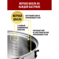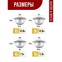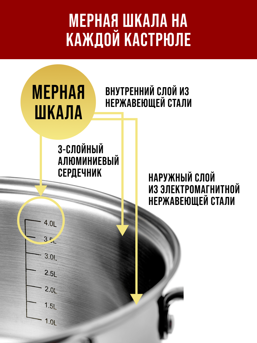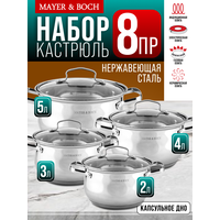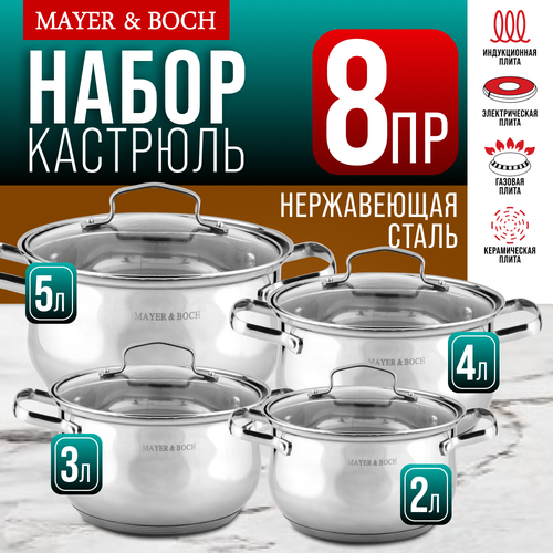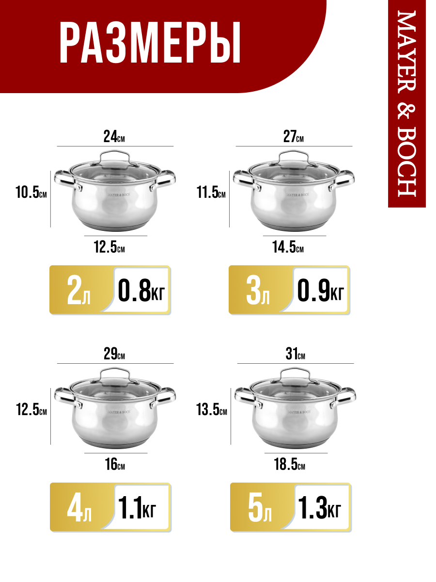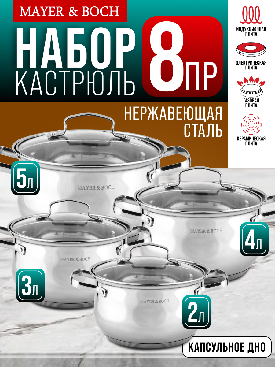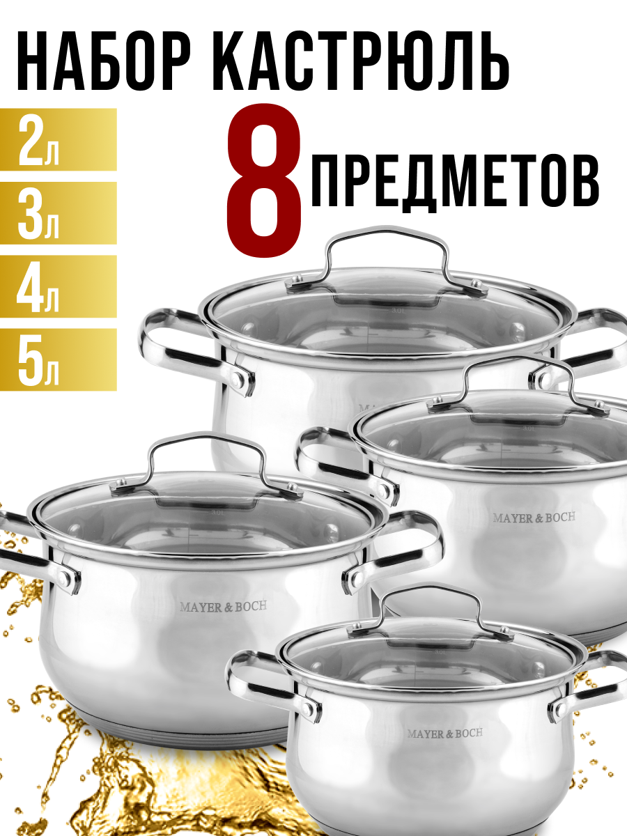 Набор кастрюль с крышками MAYER&BOCH - это высококачественная кухонная посуда с толстыми стенками, литым дном и удобными ручками, которые не нагреваются во время приготовления ваших любимых и ароматных блюд. Металлические кастрюли изготовлены из нержавеющей стали, с красивой зеркальной внешней поверхностью. Они идеальны для приготовления множества блюд: для варки каш, молока, овощей, яиц, мяса, наваристых супов и бульонов, круп, макарон, компотов, варенья, различных соусов и подлив, тушения и готовки горячих блюд. Посуда для индукционной плиты имеет многослойное капсульное дно, которое быстро и равномерно накапливает тепло и также равномерно передает его пище. Такое дно позволяет готовить блюда с минимальным количеством воды и жира, сохраняя при этом вкусовые и питательные свойства продуктов. Крышки изготовлены из жаростойкого стекла, оснащены ручками, отверстиями для выпуска пара и металлическим ободом. На внутренней стороне корпуса имеется мерная шкала. Набор для дома имеет ряд преимуществ - кастрюли высокие, у них толстые стенки, полностью безопасны для здоровья человека, не выделяют вредных веществ при контакте с пищей, долго сохраняют тепло, и никогда не потемнеют. Данная посуда - мечта каждой хозяйки, легко моется и не требует специального ухода, можно мыть в посудомойке. Благодаря высокотехнологичному оборудованию, она безупречного качества, бережно упаковывается, соответствует всем стандартам и ГОСТ. Можно использовать на индукционных, электрических, стеклокерамических панелях и газовой плите. Наслаждайтесь вкусной едой каждый день! Кастрюли с толстым дном - оригинальный и полезный подарок на День рождения, Новый год, новоселье, для мамы, бабушки, подруги.
