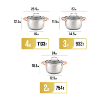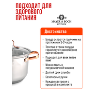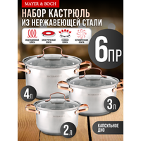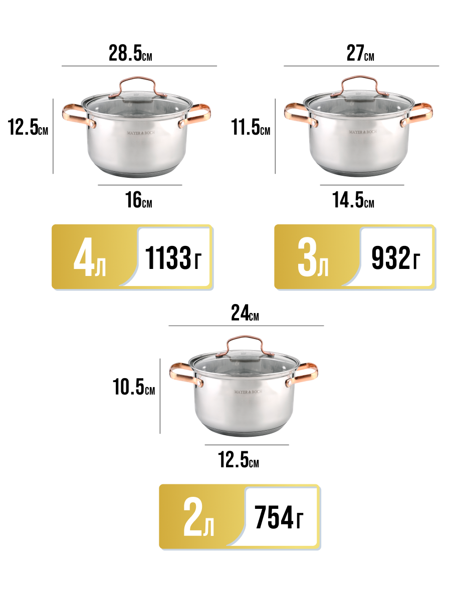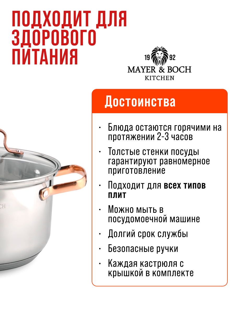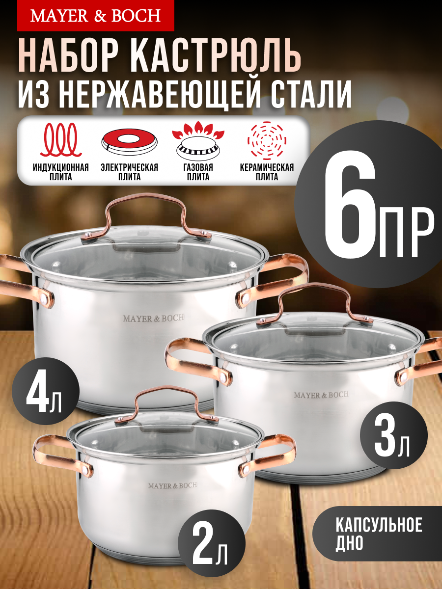 Набор кастрюль с крышками MAYER&BOCH - это высококачественная кухонная посуда с толстыми стенками, литым дном и удобными золотистыми ручками, которые не нагреваются во время приготовления ваших любимых и ароматных блюд. Металлические кастрюли изготовлены из нержавеющей стали, с красивой зеркальной внешней поверхностью. Они идеальны для приготовления множества блюд: для варки каш, молока, овощей, яиц, мяса, наваристых супов и бульонов, круп, макарон, компотов, варенья, различных соусов и подлив, тушения и готовки горячих блюд. Посуда для индукционной плиты имеет многослойное капсульное дно, которое быстро и равномерно накапливает тепло и также равномерно передает его пище. Такое дно позволяет готовить блюда с минимальным количеством воды и жира, сохраняя при этом вкусовые и питательные свойства продуктов. Крышки изготовлены из жаростойкого стекла, оснащены ручками, отверстиями для выпуска пара и металлическим ободом. На внутренней стороне корпуса имеется мерная шкала. Набор для дома имеет ряд преимуществ - кастрюли высокие, у них толстые стенки, полностью безопасны для здоровья человека, не выделяют вредных веществ при контакте с пищей, долго сохраняют тепло, и никогда не потемнеют. Данная посуда - мечта каждой хозяйки, легко моется и не требует специального ухода, можно мыть в посудомойке. Благодаря высокотехнологичному оборудованию, она безупречного качества, бережно упаковывается, соответствует всем стандартам и ГОСТ. Можно использовать на индукционных, электрических, стеклокерамических панелях и газовой плите. Наслаждайтесь вкусной едой каждый день! Кастрюли с толстым дном - оригинальный и полезный подарок на День рождения, Новый год, новоселье, для мамы, бабушки, подруги.