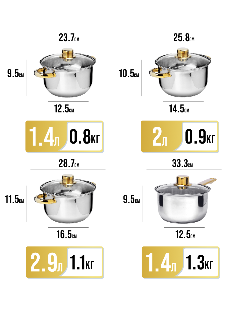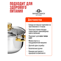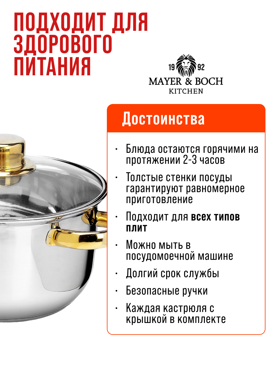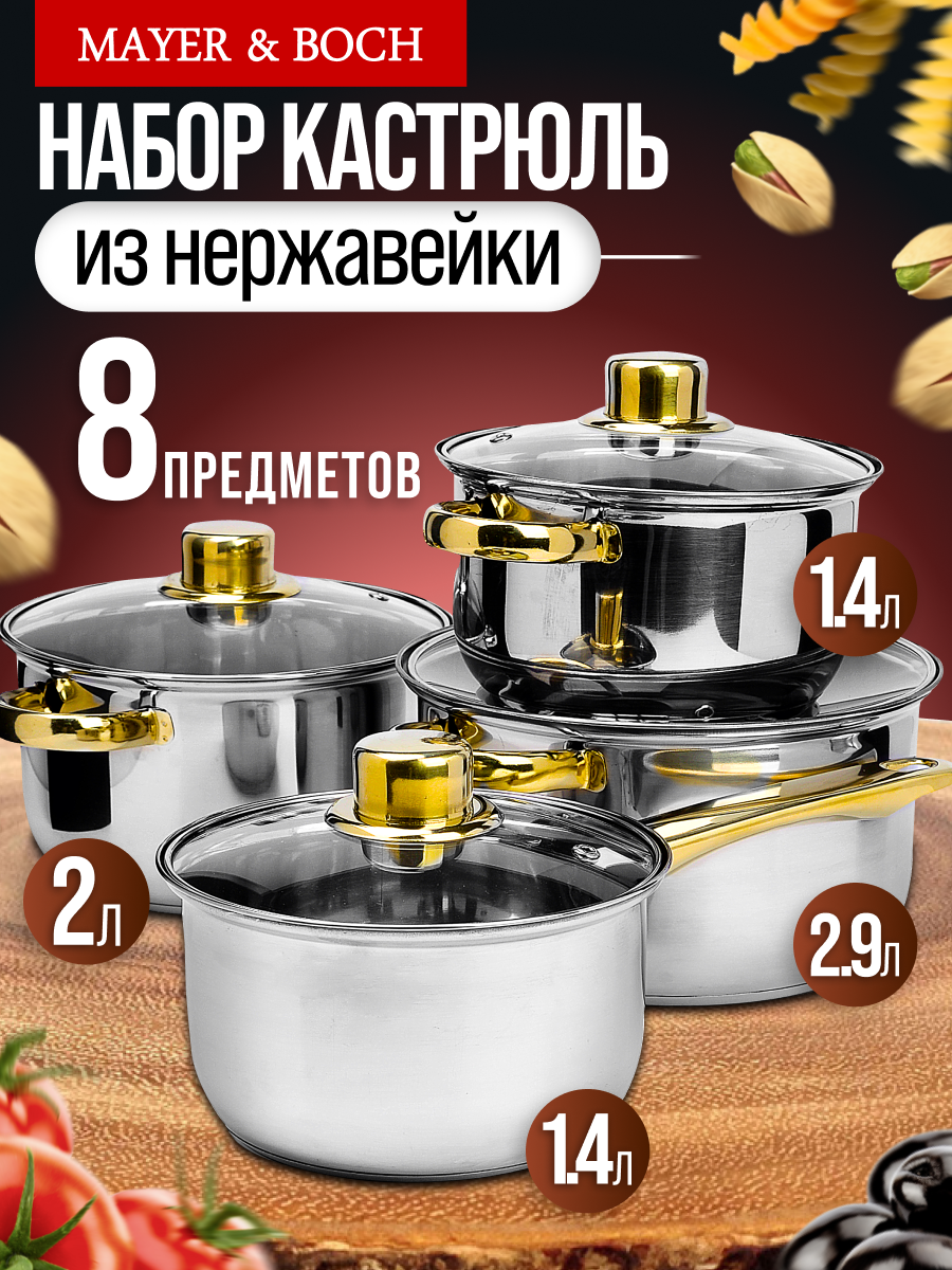 Набор кастрюль с крышкой Mayer-Boch из нержавеющей стали. Набор посуды из 8 предметов: ковш с ручкой 1,4л, кастрюля 1,4 л, кастрюля 2,0 л, кастрюля 2,9 л и 4 стеклянные крышки разного диаметра - это незаменимый предмет на любой кухне. Кастрюли имеют капсульное дно, которое быстро и равномерно нагревается; подходят для разных видов плит: газовые, электрические, индукционные и все остальные. Отлично подходят для приготовления: супа, каши, овощей, макаронных изделий и других блюд. Кастрюли из высококачественной нержавеющей стали сочетает в себе долговечность, устойчивость к коррозии, прочность и функциональность. Комплект посуды нержавеющая благодаря элегантному дизайну подойдут к любому интерьеру. Это идеальный выбор для одного, двух или трех человек. В комплект входят стеклянные крышки с металлическим ободом и клапаном для выпуска пара. Оснащены удобными термостойкими клепаными ручками с золотым покрытием. Подходят для посудомоечных машин. Нельзя использовать в микроволновых (СВЧ) печах. Изделие Mayer-Boch будет прекрасным и функциональным и практичным подарком для вас, ваших близких и знакомых, которые готовят с удовольствием и украшают праздничный стол. Поможет вам определиться с подарком на Новый год, Рождество, День Рождения, 8 марта, День Святого Валентина, Новоселье и Свадьбу. Это универсальный и полезный подарок жене, маме, бабушке, друзьям. Красивая и стильная упаковка