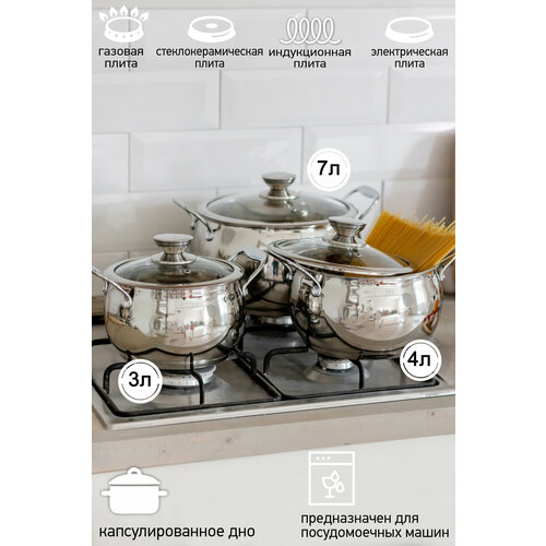 кастрюля с крышкой 3 литра - 1 шт; кастрюля с крышкой 4 литра.; кастрюля с крышкой 7 литров - 1 шт.; памятка; подарочная упаковка