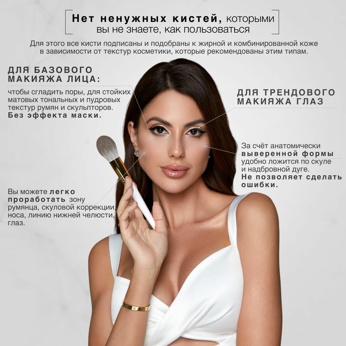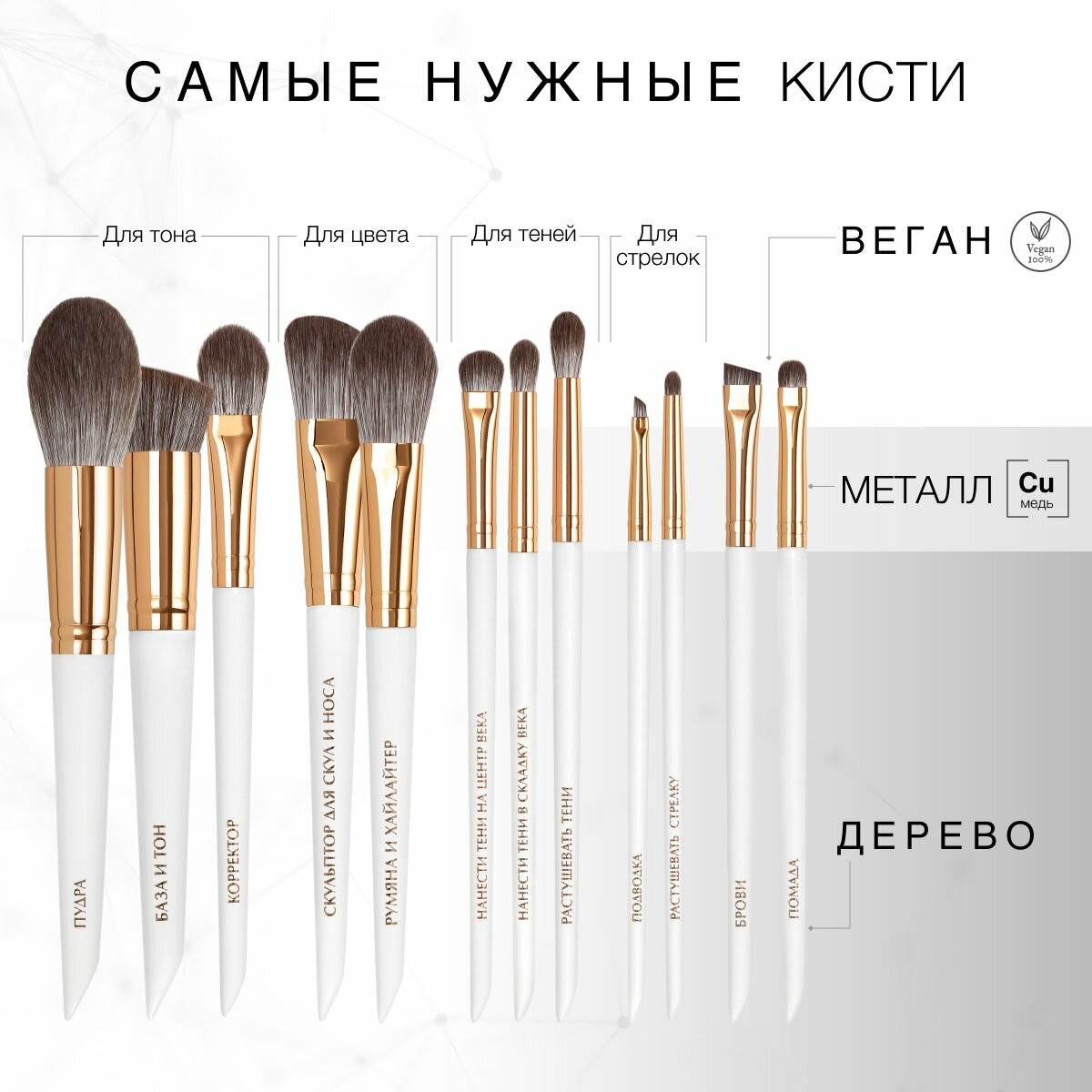 Набор косметики включает кисти, изготовленные с использованием инновационного органического нежного натурального ворса , что обеспечивает бережное отношение к коже, предотвращая раздражения и обеспечивая равномерное нанесение.