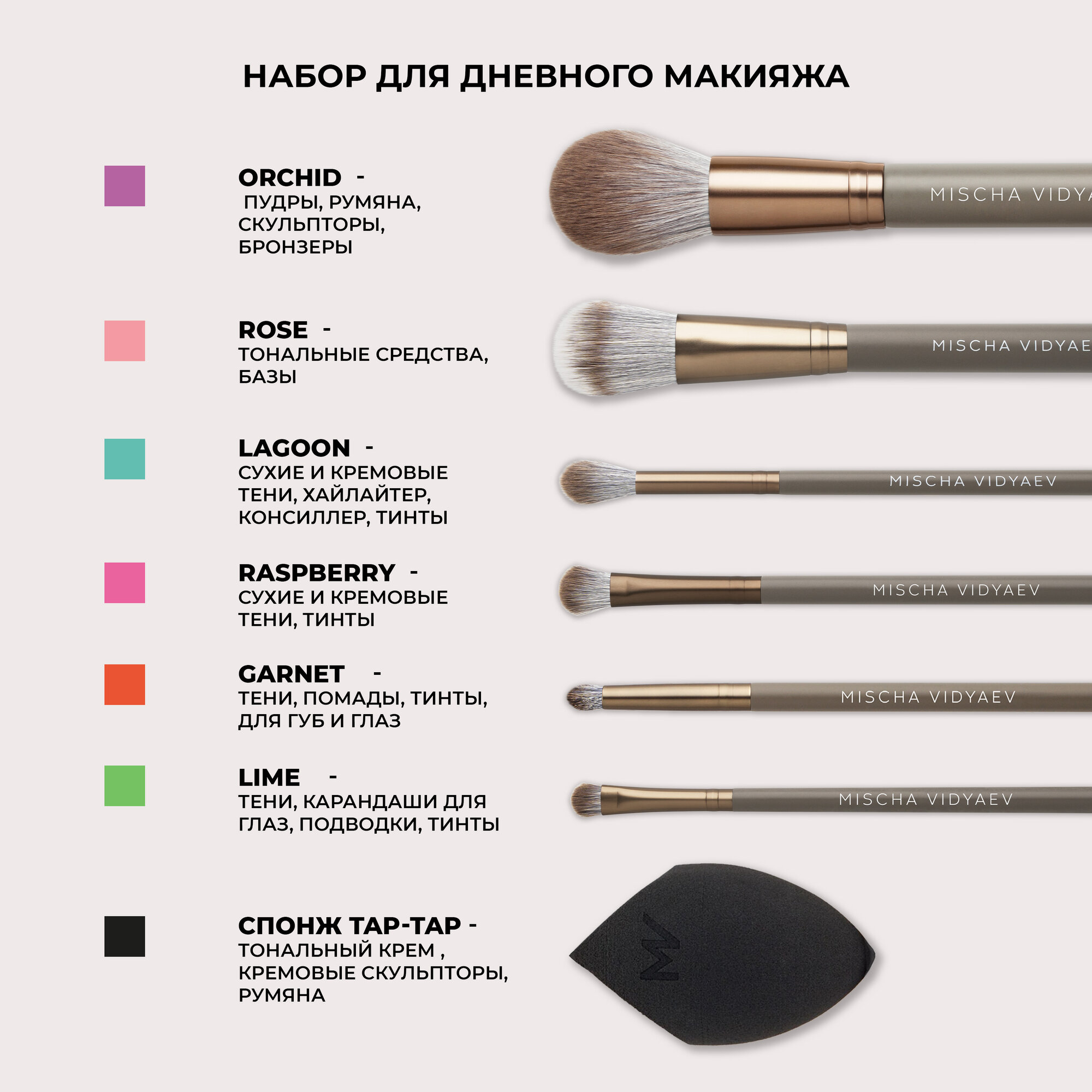 Набор кистей для дневного макияжа Dreamy Daytime от Mischa Vidyaev Beauty включает в себя все необходимые инструменты: для пудры, для тонального крема, румян, теней, хайлайтера, а также универсальный многофункциональный спонж. С помощью них вы сможете легко и быстро создать и нанести дневной макияж, , подчеркнуть скулы или, например, выделить глаза.