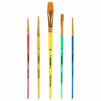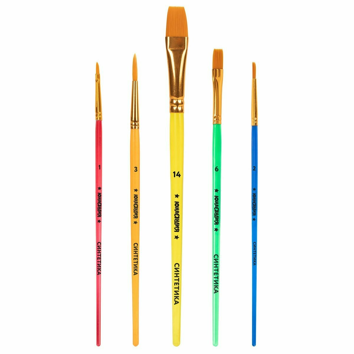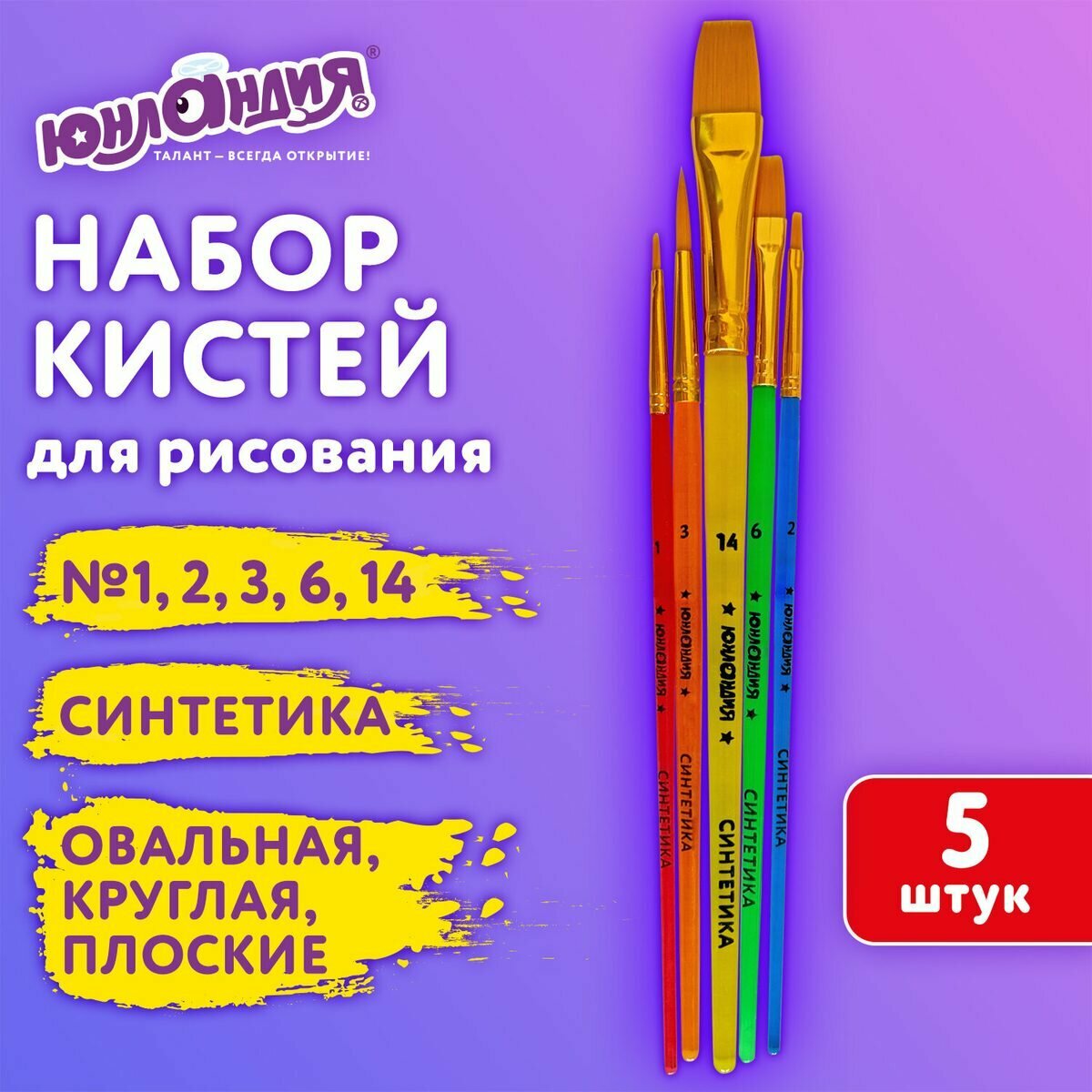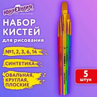 Кисти СИНТЕТИКА набор 5 шт. (круглая 3, плоская 2, 6, 14, овальная 1) блистер, ЮНЛАНДИЯ, 201069 — идеальное решение для начинающих художников и любителей творчества. Эти кисти для рисования выполнены из высококачественного синтетического ворса, который прекрасно впитывает и отдает краски, что обеспечивает ровные и насыщенные мазки. В набор входят кисточки разных размеров: круглая, плоская и овальная, что позволяет выполнять как мелкие, так и крупные детали. Пластиковая рукоятка кистей удобно ложится в руку, что делает процесс рисования комфортным и приятным. Этот набор кистей станет незаменимым помощником и в детском саду, и в школе, и дома. Кисточки ЮНЛАНДИЯ — это высокое качество и долговечность, которые оценят как дети, так и взрослые. Канцелярия для школы, которая поможет раскрыть творческий потенциал вашего ребенка, теперь еще доступнее с этим набором кистей.