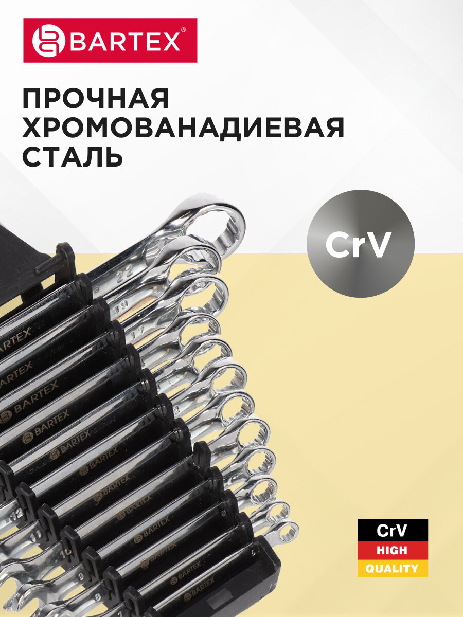 Набор ключей Bartex включает в себя 12 комбинированных ключей, изготовленных из высококачественной хромованадиевой стали. Эти ключи обладают зеркальным хромированным покрытием, что обеспечивает их долговечность и защиту от коррозии. В набор входят ключи размером от 6 до 22 мм, что делает его универсальным для различных ремонтных работ. Каждый ключ имеет двустороннюю конструкцию с головками разного размера, что позволяет сократить количество инструментов в наборе. Пластиковый держатель обеспечивает удобное хранение и транспортировку.