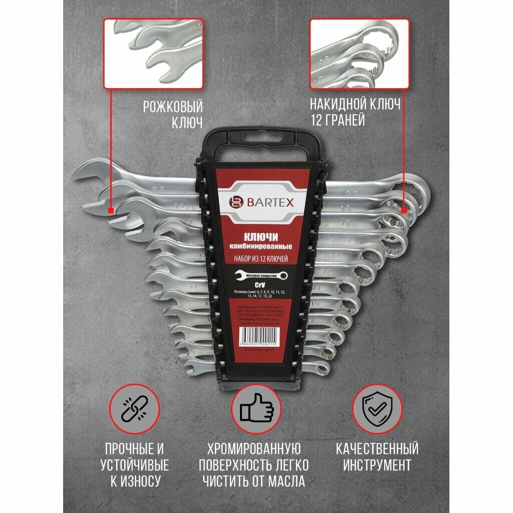 Купить Набор ключей комбинированный, М120, 12 предметов, Bartex, 6-22 мм, матовый, CrV сталь, М120 с доставкой по всей России.