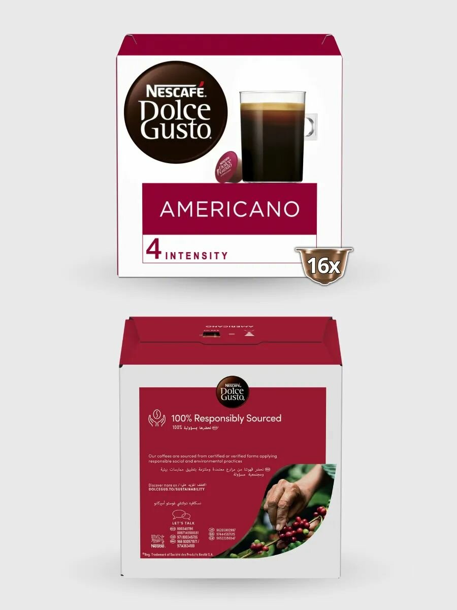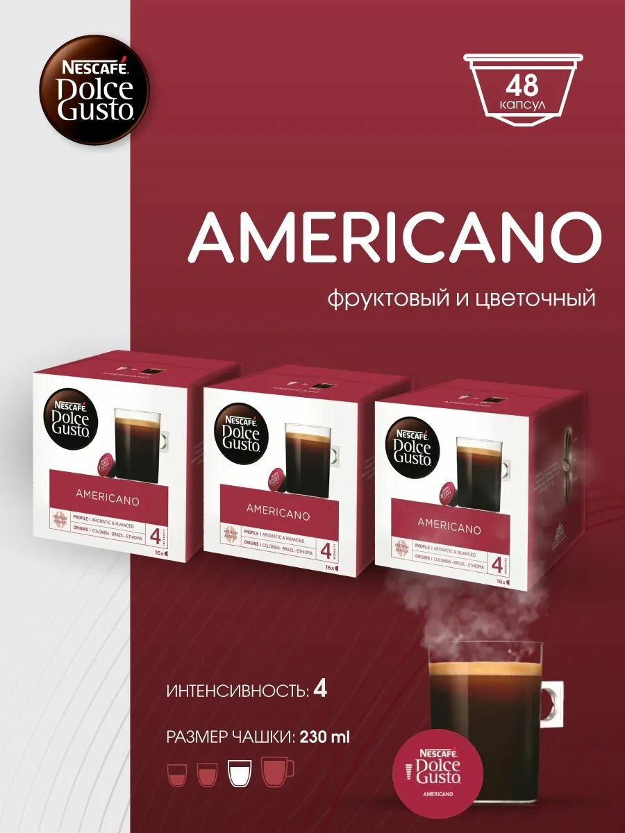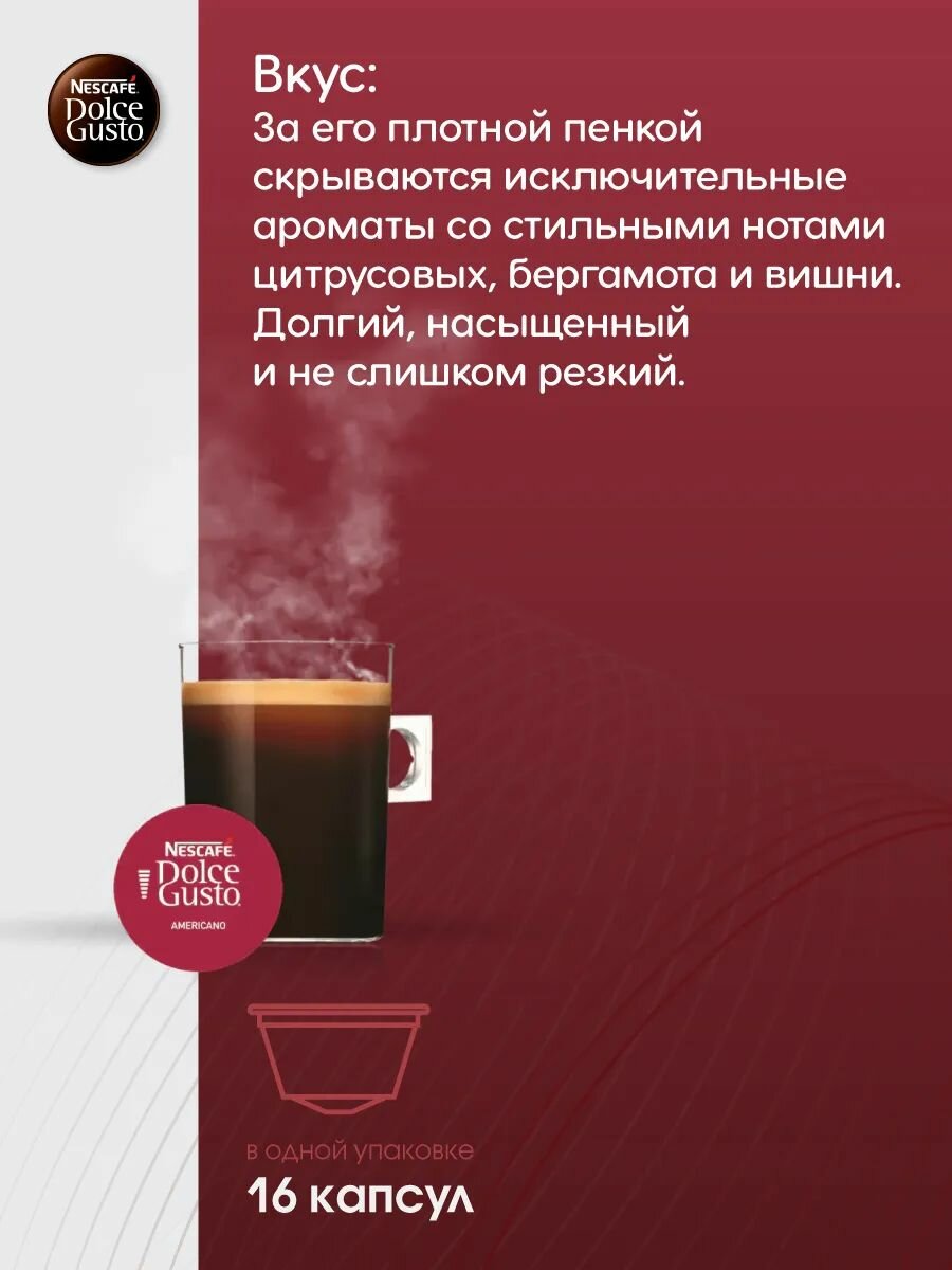 Каждая капсула Nescafe Dolce Gusto Americano это 100% арабика со средней крепостью. Большая чашка (230 мл) — элегантного кофе с фруктовыми и цветочными нотками, лёгким телом и нежной пенкой.