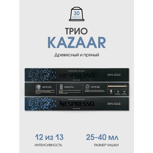 Набор из 30 капсул кофе Nespresso Kazaar. Бленд nespresso Kazaar - это невероятно интенсивный кофе: древесные, пряные ноты в кремовой текстуре. Мультикультурный Kazaar вдохновил на долгую темную обжарку бленда с большим содержанием робусты. Кофейная капсула - порция натурального жареного молотого кофе, упакованного в соответствующую ёмкость для заваривания в специальных капсульных кофеварках Nespresso. Каждая упаковка кофе в капсулах неспрессо содержит 10 капсул из алюминия. Капсулы с кофе рекомендуется хранить в сухом месте, контейнере или ящике вдали от источников тепла и прямого света. У нас Вы сможете купить кофе различных вариантов авторских блендов, для которых используются только лучшие, отборные зерна кофе свежей обжарки. Также у нас в продаже имеется три бленда без кофеина: Volluto Decaffeinato, Ristretto Italiano Decaffeinato и Arpeggio Decaffeinato. В нашем магазине Вы обязательно подберете вкус для себя и в подарок любимому человеку, коллеге, другу, которые обязательно оценят вкус любимого напитка! Данный товар произведён в Швейцарии и подходит для кофе машин nespresso original. Наслаждайтесь изысканным вкусом и ароматом оригинального кофе Неспрессо. Будем благодарны за отзыв!